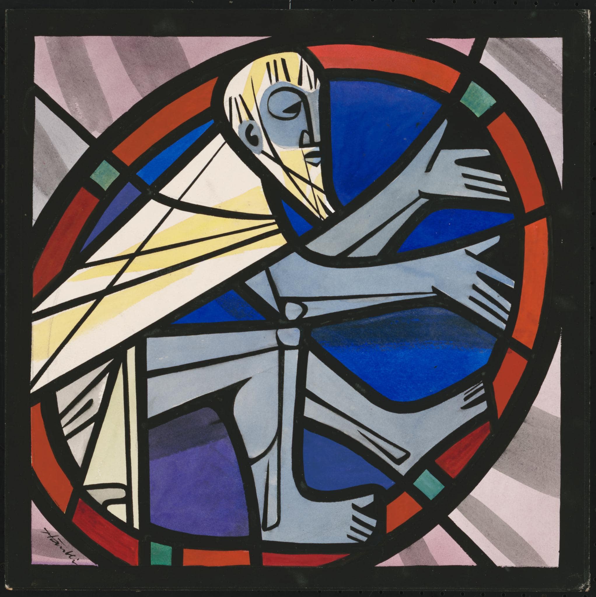 Darstellung des antiken griechischen Philosophen Diogenes, der als bärtiger Mann mit einer Toga bekleidet in seinem Fass sitzt, an dem er sich mit Händen und Füssen abstützt. Die Öffnung des Fasses ist rot und grün gefasst. Während das Fassinnere tiefblau leuchtet, ist der Hintergrund in Zartrosa und Grau gehalten. Diogenes weiss behaarter Kopf sowie die helle Toga treten gegen den eher dunklen Hintergrund stark hervor.