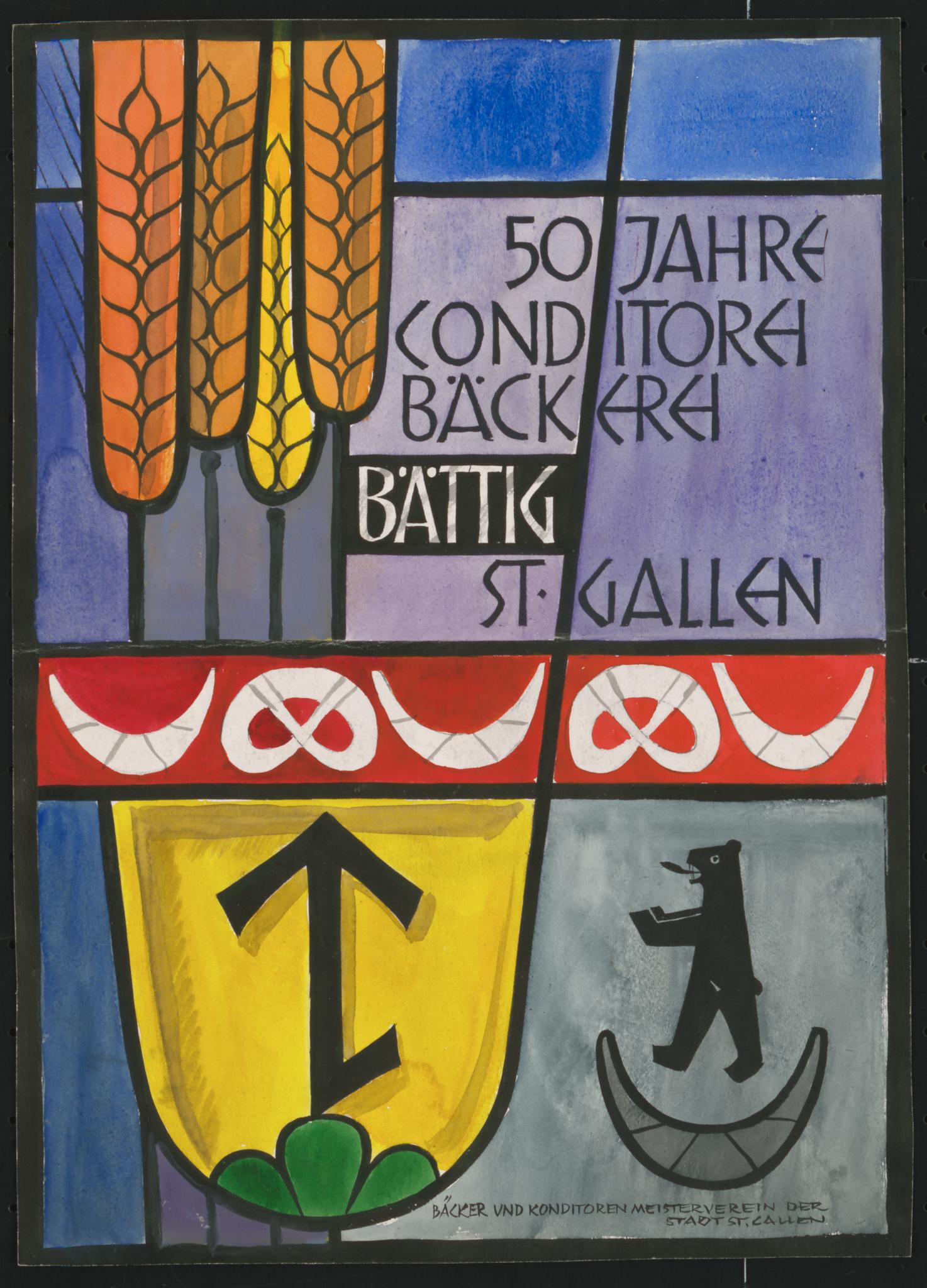 Farbiger Entwurf für eine Wappenscheibe: Vor blauem und lila-grauem Grund vier goldene Weizenähren, ein horizontales rotes Band mit alternierenden Croissants und Brezen, darunter der Wappenschild Bättig und das Wappen der Stadt und Fürstabtei St. Gallen über einem Croissant (möglicherweise auch das Wappen des Bäcker- und Konditoren-Meistervereins der Stadt St. Gallen).