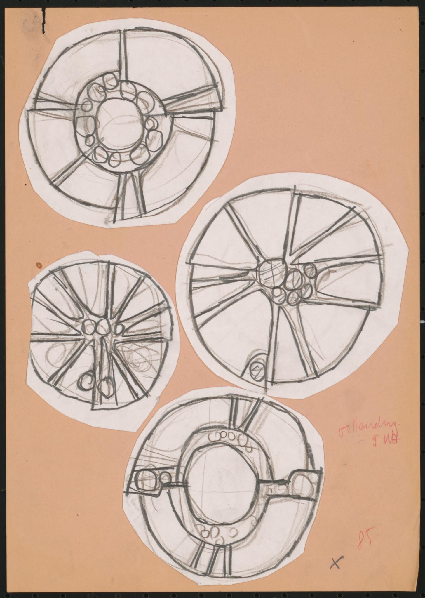 Diese Skizze zeigt die Entwurfspraxis des Künstlers Heinrich Stäubli. Erprobt wurden unterschiedliche Gestaltungsmöglichkeiten von Betonverglasungen. Die Kreisformen sind von aussen nach innen von grossen Elemente (später in Gussglas ausgeführt) hin zu kleineren runden Elementen aufgebaut. Betonfugen unterteilen die einzelnen Elemente wie Radspeichen.