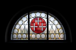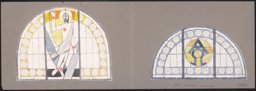 Entwurf für zwei verschieden grosse Rundbogenfenster mit den drei Kreuzen auf dem Hügel Golgatha und dem Engel, der die Auferstehung Christi verkündet. Beide Fenster sind mit einem umlaufenden breiten Ornamentband aus weissen Kreisen auf blauem bzw. grauem Grund versehen.