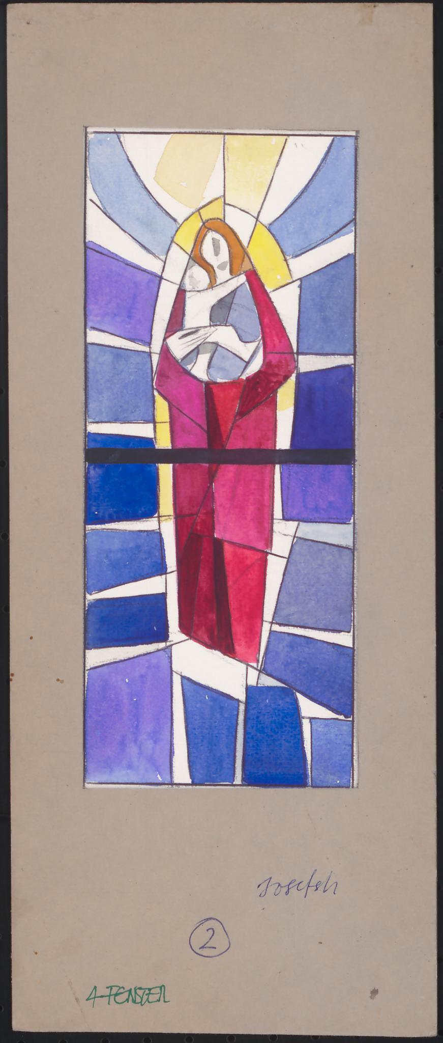Entwurf für ein hochrechteckiges Fenster: Madonna in rotem Gewand mit dem Christuskind auf dem Arm in einer gelblichen Aureole. Das Licht scheint strahlenförmig von den Figuren auszugehen. Rechteckige Farbfelder in Blau- und Violettönen umgeben die zwei Figuren.