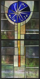 Entwurf für ein hochrechteckiges Fenster mit einem Morgenstern vor tiefblauem Kreis mit weissen Punkten im oberen Bilddrittel. Der Kreis ist mit einem hellen Halbkreis umfangen und leitet in einer Art vertikalem Lichtstrahl in Gelb und Orange in den unteren Bildteil über. Die Darstellung wird von grauen Rechtecken gerahmt.