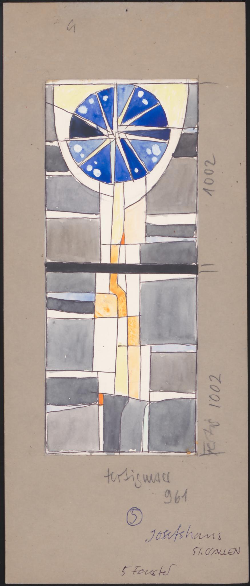 Der Entwurf gehört zum 5. Fenster eines insgesamt sechsteiligen Bildzyklus für die Kapelle des Altersheim Josefshaus in der Villa Jacob, St. Gallen (VMR_10048), der 1990 ausgeführt wurde. Die ausgeführte Glasmalerei entspricht im Wesentlichen dem Entwurf.