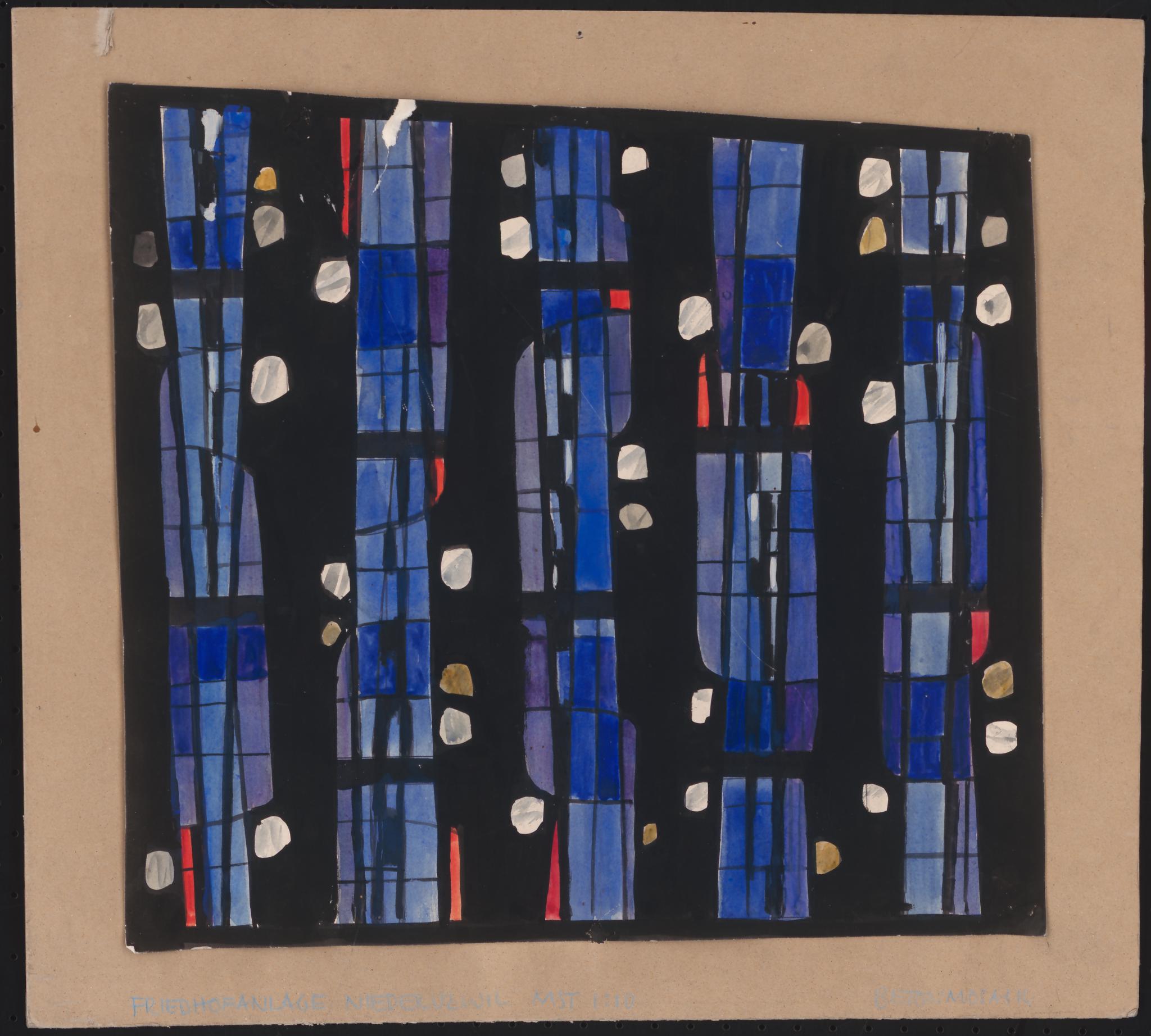 Heinrich Stäubli fertigte 1974 mindestens drei verschiedene Entwürfe für eine trapezförmige Betonglaswand für die Abdankungshalle auf dem Friedhof Niederuzwil SG an. Zwei der drei Entwürfe dokumentieren Stäublis Auseinandersetzung mit einer abstrahierten Darstellung der sieben Wunden Christi (siehe HS_436 · HS_445). Ausgeführt wurde schliesslich dieser Entwurf mit einer Komposition aus mehreren vertikalen Farbbahnen in mehrheitlich Blau- und Rottönen (HS_1058).