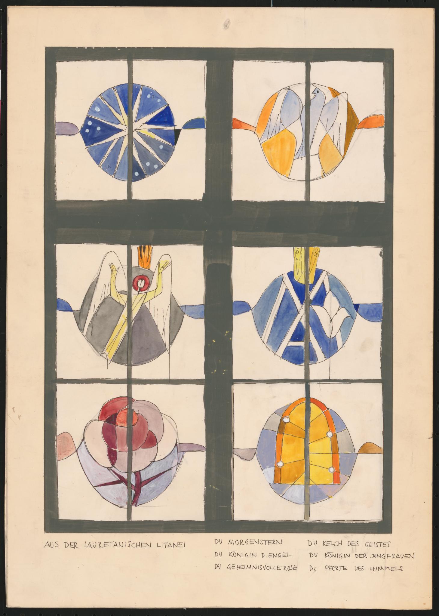Entwurf für ein Kreuzstockfenster (grauer Rahmen) zum Thema der Marienverehrung und der Lauretanischen Litanei. Die Sprossen unterteilen das Fenster in sechs gleichgrosse Felder. Jedes Feld zeigt ein Mariensymbol in einer Kreisform. Von links oben nach rechts unten: Morgenstern, Vogel und Kelch, gekrönter Engel, Marienmonogramm und weisse Lilie, Rose und Himmelspforte.