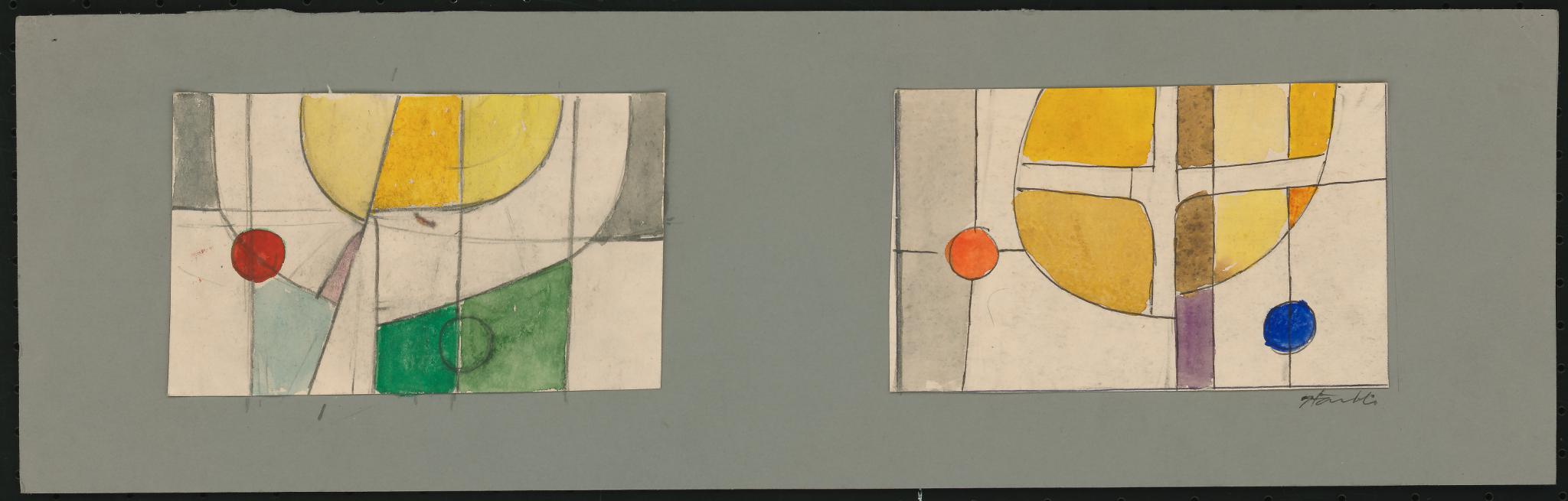 Entwurf für zwei lrechteckige Fenster: links eine gelb-weisse Halbkreisform (Sonne) und rechts ein griechisches Kreuz vor Sonne oder gelbem Nimbus, dazu farbige Punkte in beiden Fenstern.