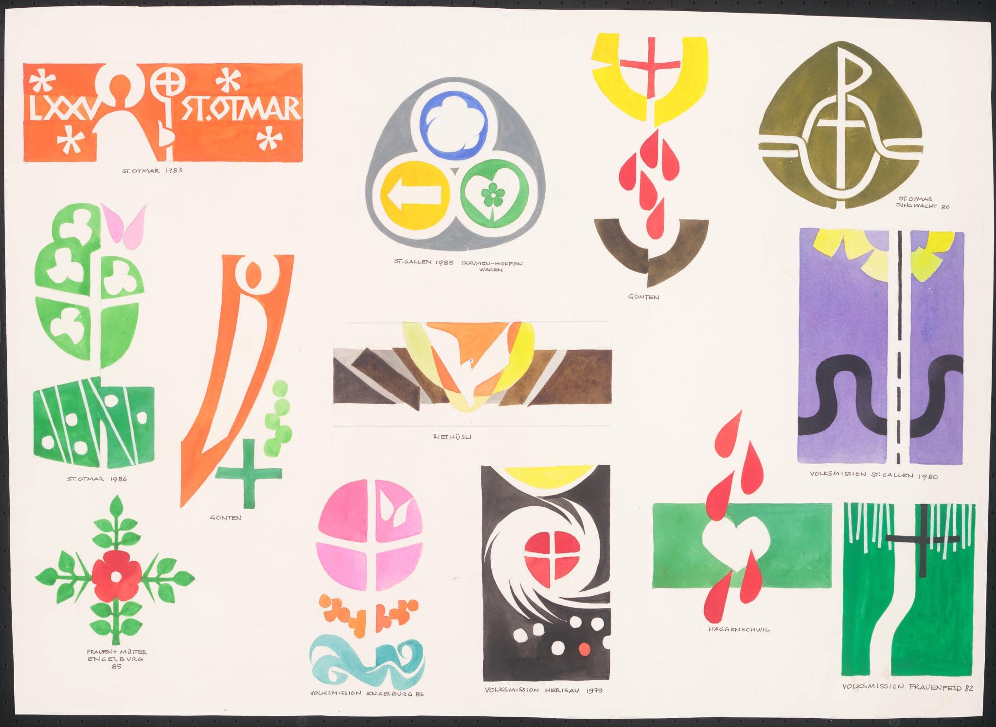 Die Collage zeigt diverse Osterkerzensignets und Symbole der Jahresthemen von Kirchgemeinden (St. Otmar, Riethüsli) wie auch von Volksmissionen, Frauen und Mütter-Vereinen und Jungwachten im Kanton St. Gallen. Die Motive sind in der Regel abstrahiert und nehmen Bezug auf die christliche Ikonografie (Kreuz, Wein als Blut Christi, Taube). Die Signets und Symbole oder Logos datieren aus den Jahren 1979 bis 1986 und wurden vermutlich nachträglich in dieser Collage zusammengeführt.
