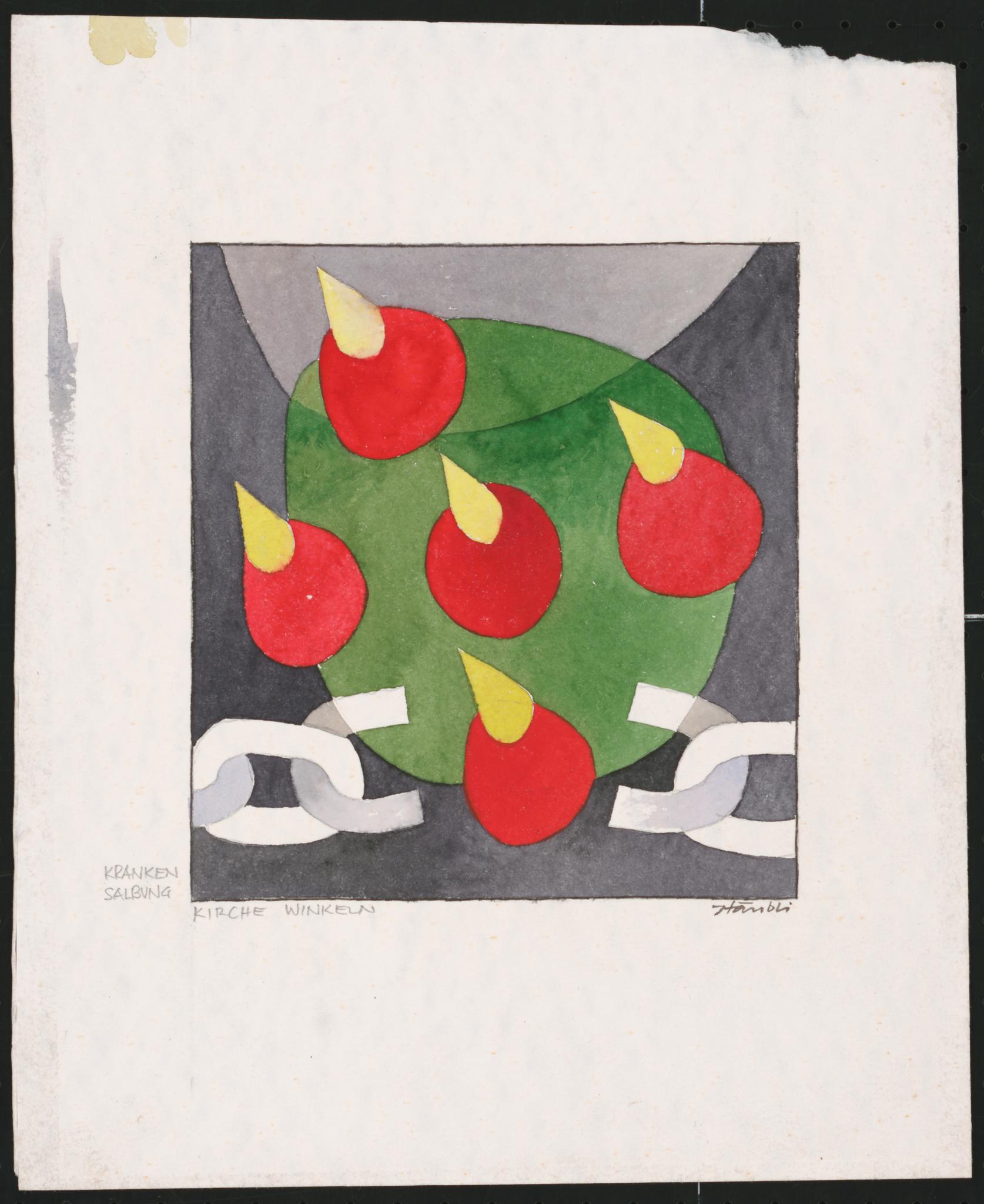 Entwurf für eine quadratische Glasmalerei: Vor einem grünen Oval im Zentrum sind fünf kleine rote Kreise mit gelben Tropfen (oder Flammen) gesetzt, möglicherweise symbolisieren sie die Wunden Christis auf die Öl getropft wird. Darunter eine in zwei Teile zerbrochene eiserne Kette. Der Hintergrund ist grau gefasst.