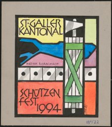 Farbiger Entwurf einer Figurenscheibe mit einer jungen Bogenschützin im Zentrum. Sie hat den Pfeil gerade losgelassen, ihre Arme verharren noch in Schusshaltung und die stilisierten roten Haare scheinen im Wind zu wehen. Links neben der Figur steht das runde Wappen des Kantons St. Gallen. Der Hintergrund ist in vier monochrome Farbflächen unterteilt.