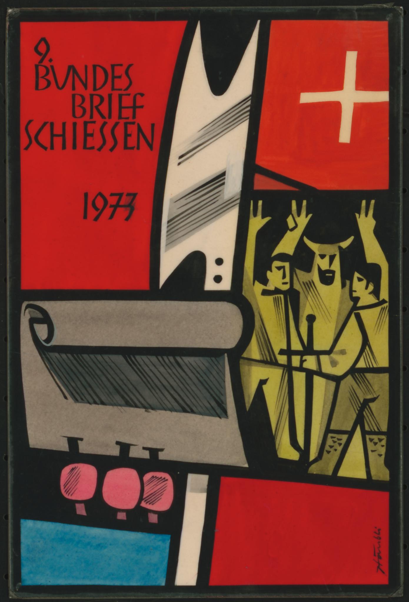 Farbiger Entwurf für eine Wappenscheibe anlässlich des Bundesbriefschiessens im Jahr 1973. Die Zeichnung kombiniert den Bundesbrief mit drei rosa Siegeln, die Hellebarde als historisches Symbol für die Schweizer Wehrhaftigkeit und eine Szene der drei Eidgenossen beim Schwur mit der Schweizer Flagge vor rotem Grund.