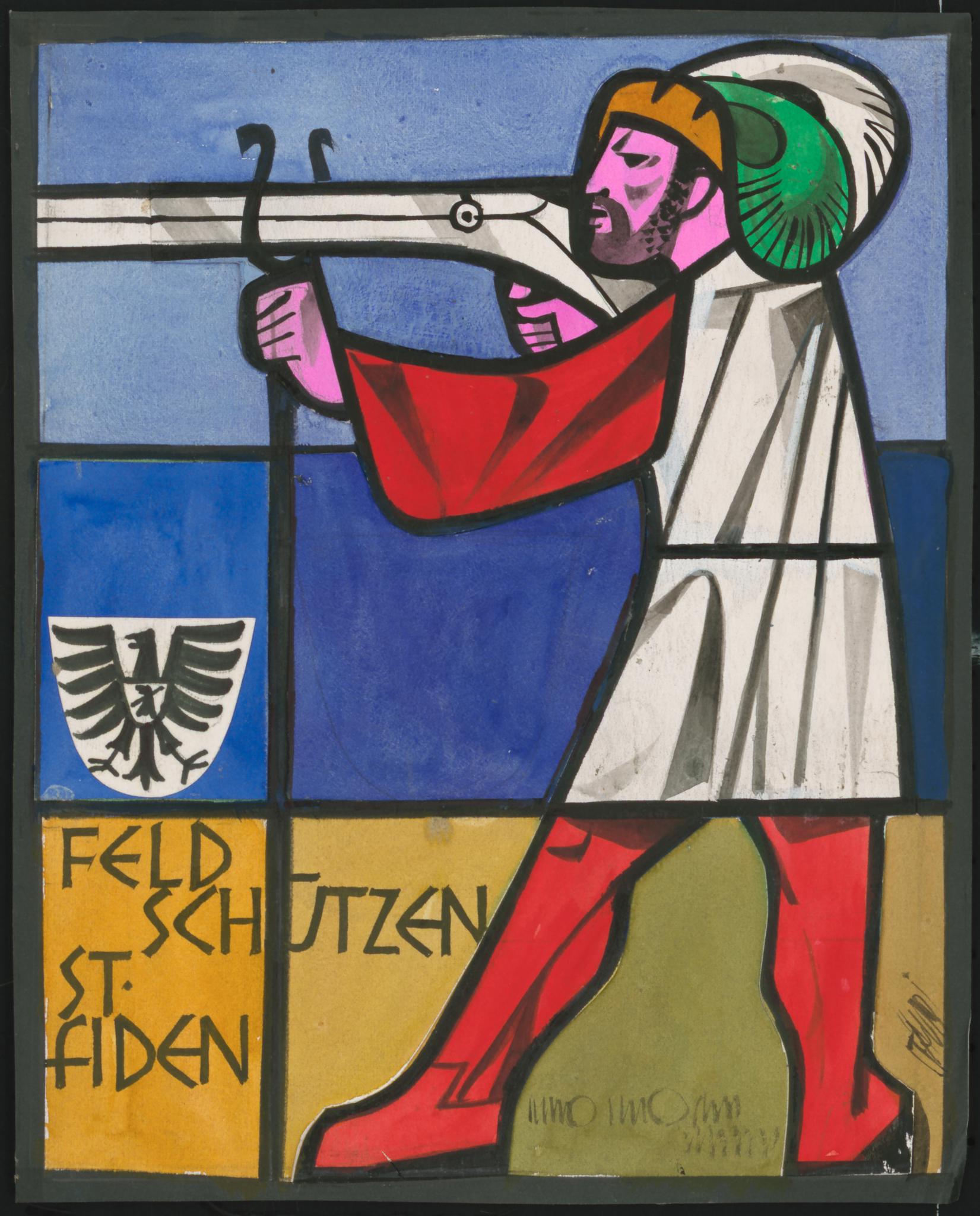 Entwurf für eine hochrechteckige Glasmalerei, die einen breitbeinig stehenden Mann mit Gewehr zeigt. Der Mann blickt im Profil nach links. Er trägt ein historisches Gewand mit weissem Kittel und roten Strümpfen, dazu einen Hut mit Federn. Er schiesst mit einer historischen Waffe, möglicherweise eine Radschlossbüchse mit geschwungenem Abzugsbügel, die aufgrund ihres Gewichts auf eine Stützgabel gelegt wird. Dazu das Wappen der Ortsgemeinde St. Gallen-Tablat in der Fassung von vor 1978.
