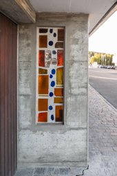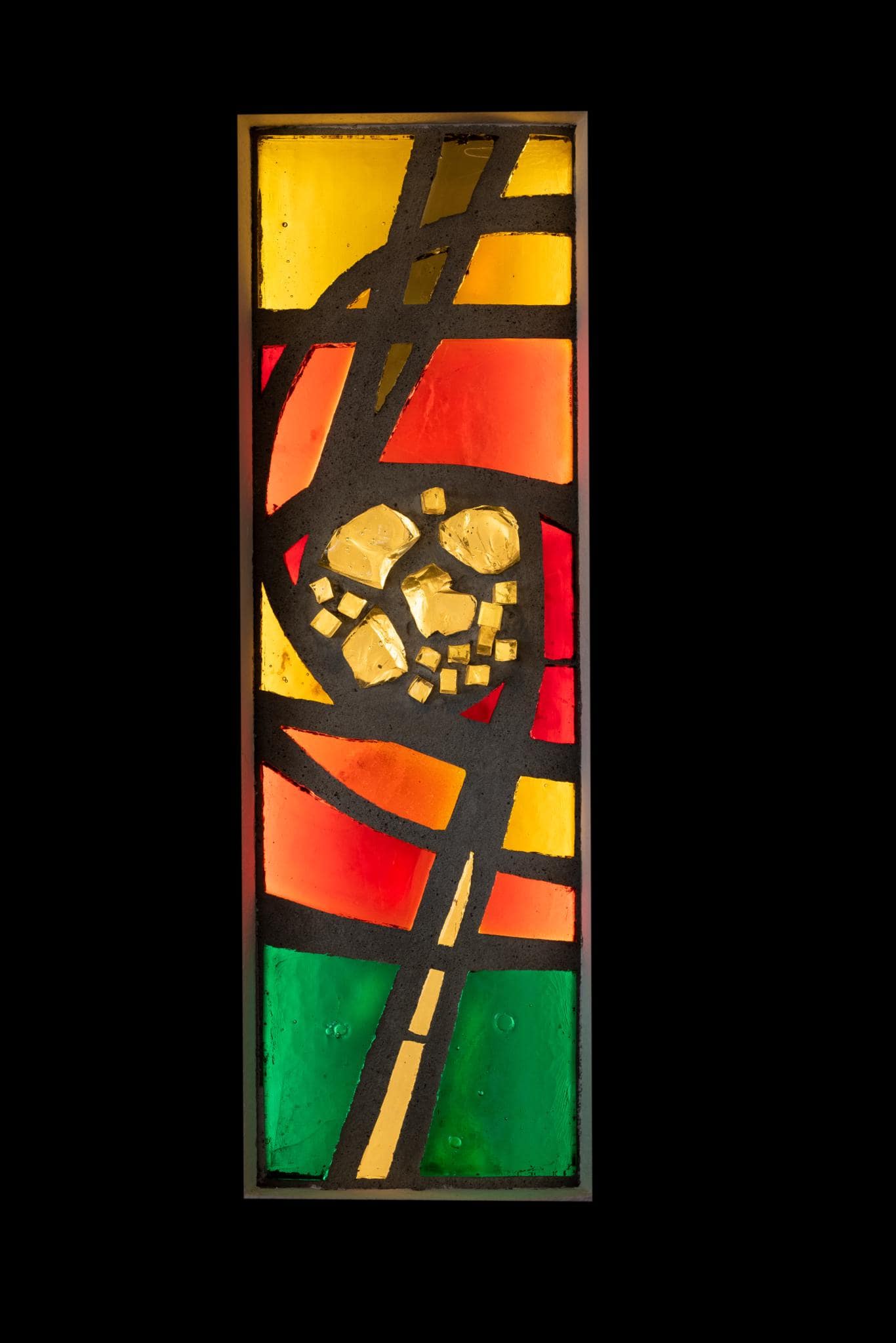 Längsrechteckige Betonverglasung in Gelb, Rot und Grün. Diagonal ansetzende Linien treffen sich mittig in der mit kristallförmig zugeschlagenem Dallglas besetzten Spirale.