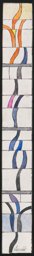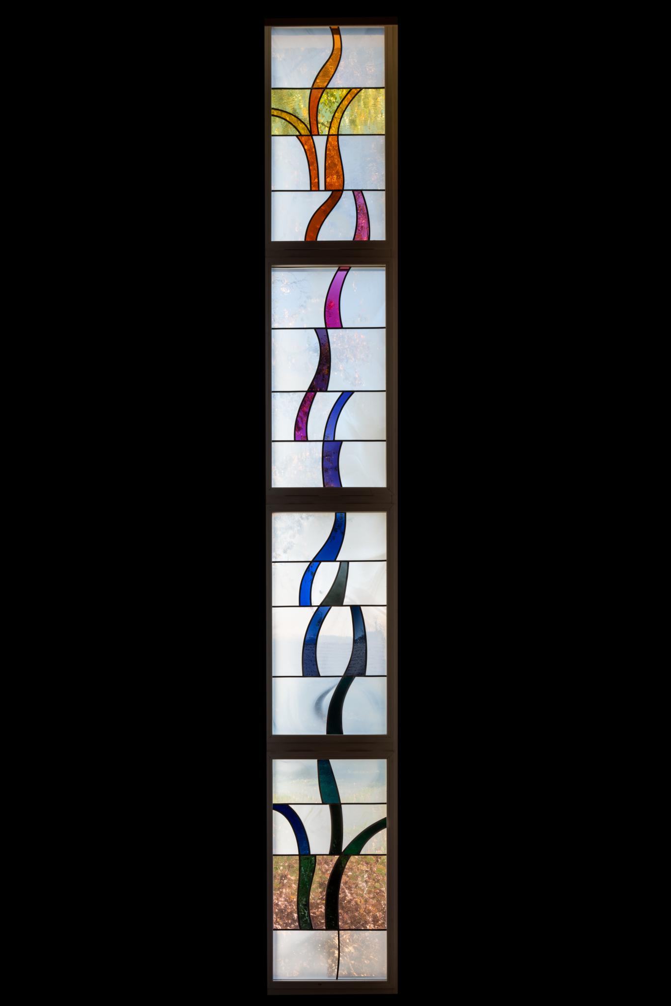 Ornamentverglasung bestehend aus vier vertikal gestaffelten Fenstern, die von horizontalen Bleien in jeweils vier unterschiedliche hohe Felder unterteilt werden. Von unten nach oben ziehen sich fortlaufende gekrümmte und vegetabile Formen aus Farbglas, die sich vom umgebenden opaken weissen Glas absetzen. Als regenbogenartiger Farbverlauf gehen die dunklen grünen Tönen in Blau und Lila bis in Rot- und Orangetönen über. Es entsteht der Eindruck einer der Sonne entgegenwachsenden Pflanze. Im obersten und untersten Fenster gibt es je eine blankverglaste Scheibe.
