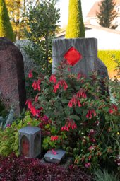 Grabstein aus grauem Naturstein mit rotem Dallglas in Rautenform im oberen Drittel. Das Gussglas ist grob behauen und das leuchtende Rot setzt sich prominent vom grauem Stein ab. Auf halber Höhe des Grabsteins ist eine Weizenähre im Relief angebracht.