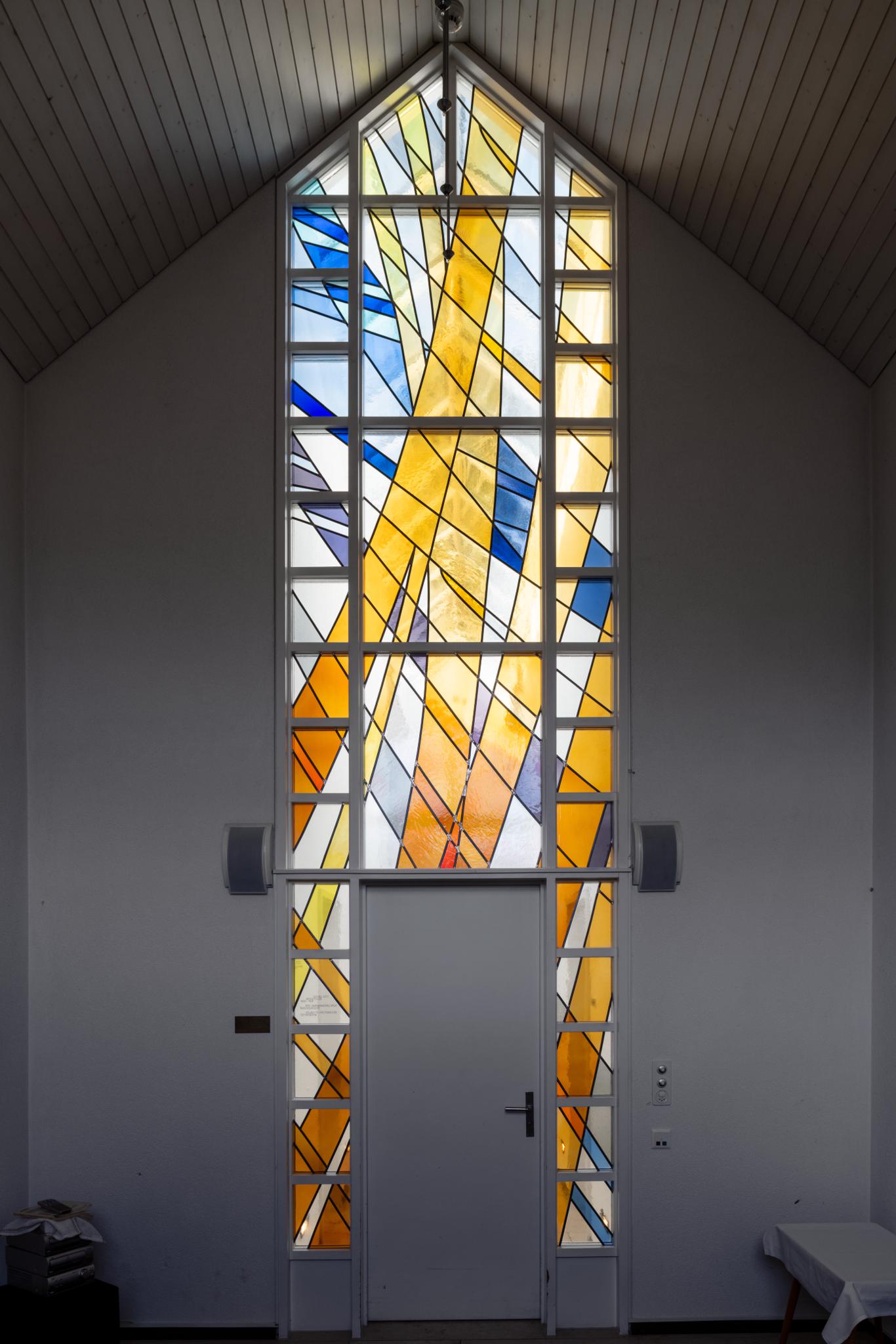 Farbige Glaswand, die sich vom Dreiecksgiebel der Kapelle bis zum Boden aufspannt: Fortlaufende Ornamentverglasung aus sich kreuzenden Bändern in Komplementärfarben (Gelb, Orange, Blau, Violett). Die Glaswand ist durch breite Sprossen in klein- und grossformatige Quadrate und, im oberen Abschluss, Dreiecksformen unterteilt. Wie ein Windfang rahmt die Glasmalerei zudem die Tür, die von der Kapelle zum Foyer des Altersheim führt, auf beiden Seiten ein.