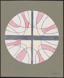 Das Rundfenster in der kleinen Kapelle des Altersheims in Degersheim liegt gegenüber einer zweiten raumgreifenden abstrakten Verglasung des St. Galler Glasmalers Heinrich Stäubli (HS_1052). Im Nachlass des Ateliers Stäubli hat sich ein Entwurf erhalten, der eine Variation der rosa-weissen Ornamentverglasung zeigt (HS_407).