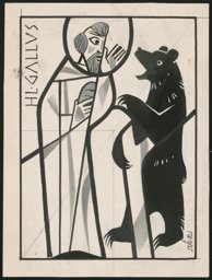 Im Jahr 1964 wurden dem Rathaus Goldach anlässlich des 500-jährigen Jubiläums der Verleihung des Dorfrechts mehrere Glasmalereien gestiftet: zwei Fenster mit Wappenscheiben aus dem Atelier von Andreas Kübele SG (1907–1965), die heute in einer Stube im Untergeschoss eingebaut sind, und vier der fünf Wappen- und Figurenscheiben von Heinrich Stäubli, die heute in der ostseitigen Fensterverglasung des Rathaussaals integriert sind. Darunter diese Figurenscheibe mit Gallus und Bär. Mehrere Entwürfe, die das Motiv von heiligem Gallus mit Bär in einer ähnlichen Komposition zeigen, haben sich im künstlerischen Nachlass des Ateliers Stäubli erhalten (HS_131 · HS_629). Die katholische und die reformierte Kirchgemeinde, die Schulgemeinde Goldach und die Kantonsregierung stifteten die Scheiben. Die heute grösste und im Zentrum der Fensterverglasung eingesetzte Scheibe mit der Darstellung der Justitia wurde um 1984 als private Stiftung zum Andenken an Gemeinderat Florian Eilinger (Amtszeit 1963–1984) ergänzt. Die jetzige Anordnung der Scheiben in der Fensterverglasung entstand wohl erst nach 1984 (siehe weiteres Bildmaterial).
