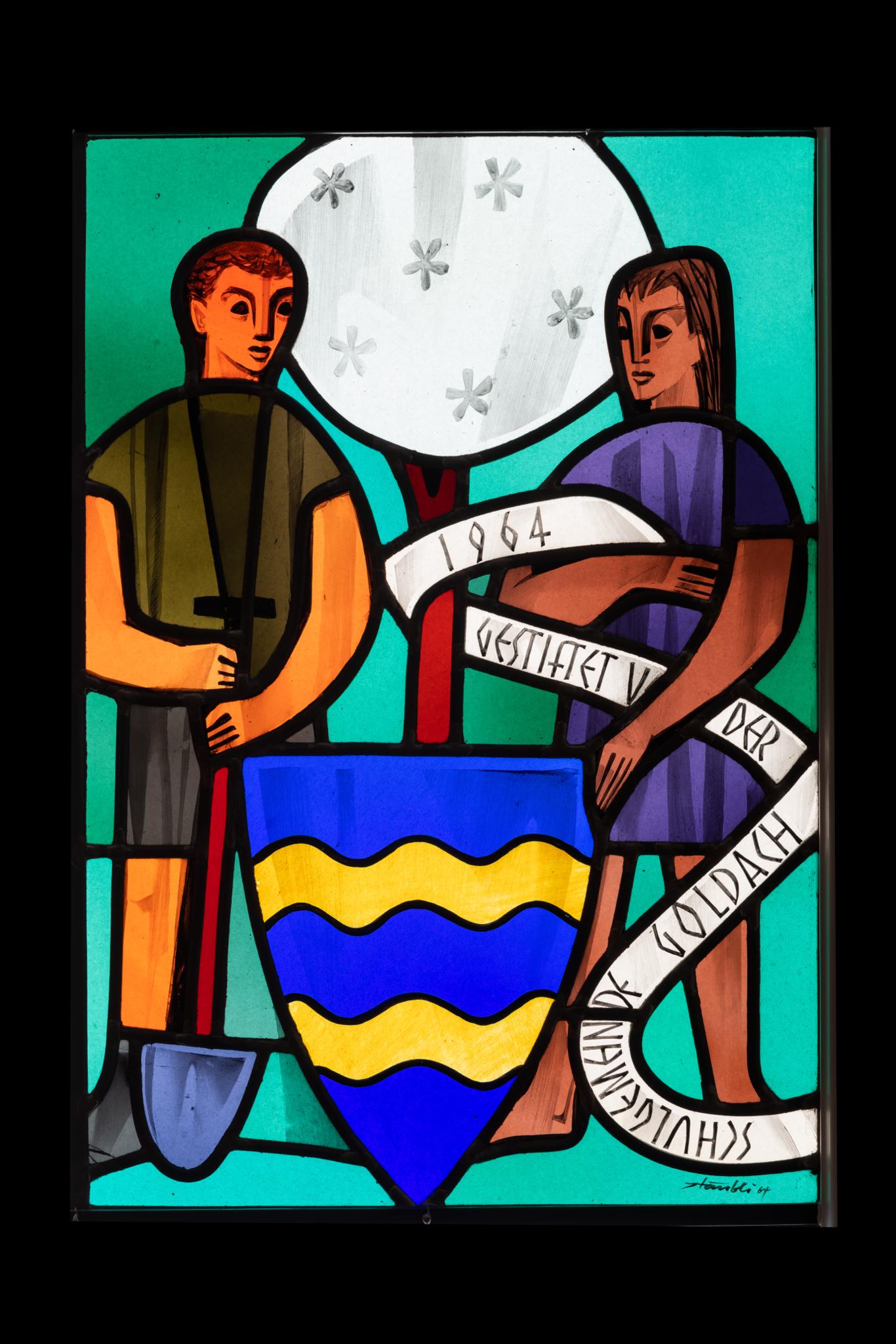 Wappenscheibe mit jungem Mann in braun-grüner Arbeitskleidung und mit Spaten und einer jungen Frau im Kleid, die ein weisses Schriftband hält. Zwischen ihnen ein weiss blühender Baum, darunter das Wappen der Gemeinde Goldach. Möglicherweise stehen Mann und Frau sowie die Pflanzung eines blühenden Baum symbolisch für die Jugend, insbesondere da die Schulgemeinde Goldach als Stifterin fungierte.
