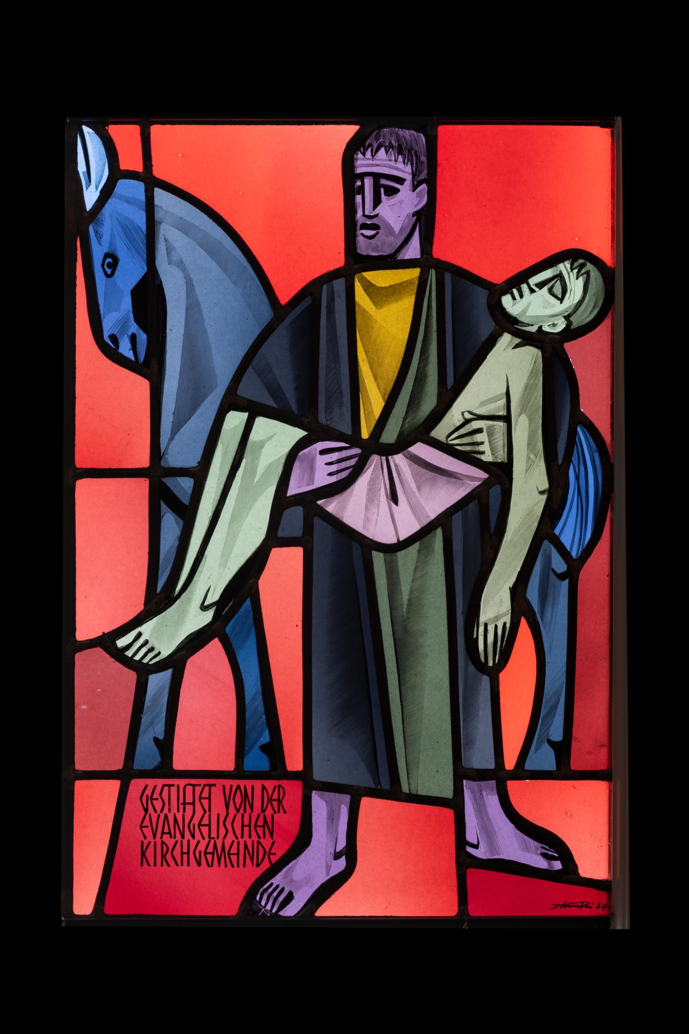 Im Jahr 1964 wurden dem Rathaus Goldach anlässlich des 500-jährigen Jubiläums der Verleihung des Dorfrechts mehrere Glasmalereien gestiftet: zwei Fenster mit Wappenscheiben aus dem Atelier von Andreas Kübele SG (1907–1965), die heute in einer Stube im Untergeschoss eingebaut sind, und vier der fünf Wappen- und Figurenscheiben von Heinrich Stäubli, die heute in der ostseitigen Fensterverglasung des Rathaussaals integriert sind, darunter diese Figurenscheibe. Die katholische und die reformierte Kirchgemeinde, die Schulgemeinde Goldach und die Kantonsregierung stifteten die Scheiben. Die heute grösste und im Zentrum der Fensterverglasung eingesetzte Scheibe mit der Darstellung der Justitia wurde um 1984 als private Stiftung zum Andenken an Gemeinderat Florian Eilinger (Amtszeit 1963–1984) ergänzt. Die jetzige Anordnung der Scheiben in der Fensterverglasung entstand wohl erst nach 1984 (siehe weiteres Bildmaterial).