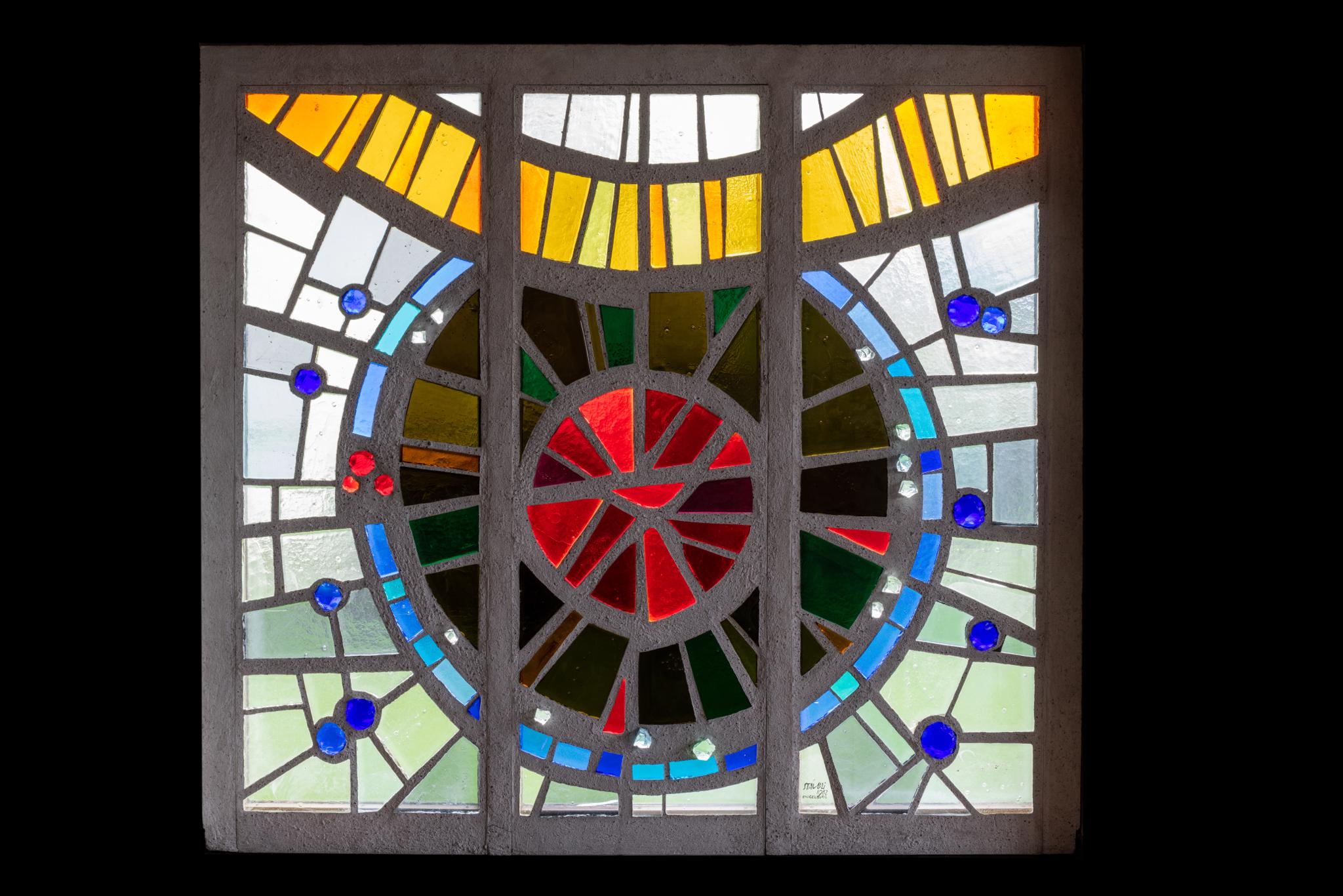 Grossformatige quadratische Betonverglasung: Im Zentrum eine grün-braune Kreisform mit rotem Kern und hell-blau leuchtender Umrandung, in welche kristallförmig zugeschlagenes Dallglas eingesetzt ist. Die Kreisform wird von hellgrünem, farblosem und hellgrauem Glas gerahmt, das von blauen Punkten (kristallförmig zugeschlagenes Dallglas) locker akzentuiert wird. Im oberen Bilddrittel zieht sich ein gelbes halbkreisförmiges Band durch das Bildfeld, das möglicherweise eine Sonne symbolisiert. Das Bildthema, die vier Elemente, ist anhand der Farben identifizierbar: Rot (Feuer), Blau (Wasser), Grau (Luft), Grün (Erde). Die Erde als Himmelskörper steht prominent im Zentrum.