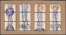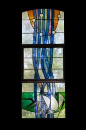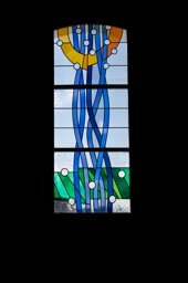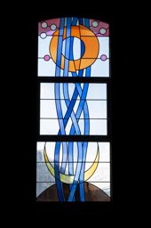 Zweifach horizontal unterteiltes Segmentbogenfenster mit der Darstellung von Regen (dünne blaue Bänder), dem Mond (blauer Kreis), den Sternen (gelbe Punkte) und der Erde (brauner Hügel) auf farblosem Grund. Auffallend ist der ausgeprägte Hobel bzw. die Bläselung des verwendeten farbigen und farblosen Echtantikglases.