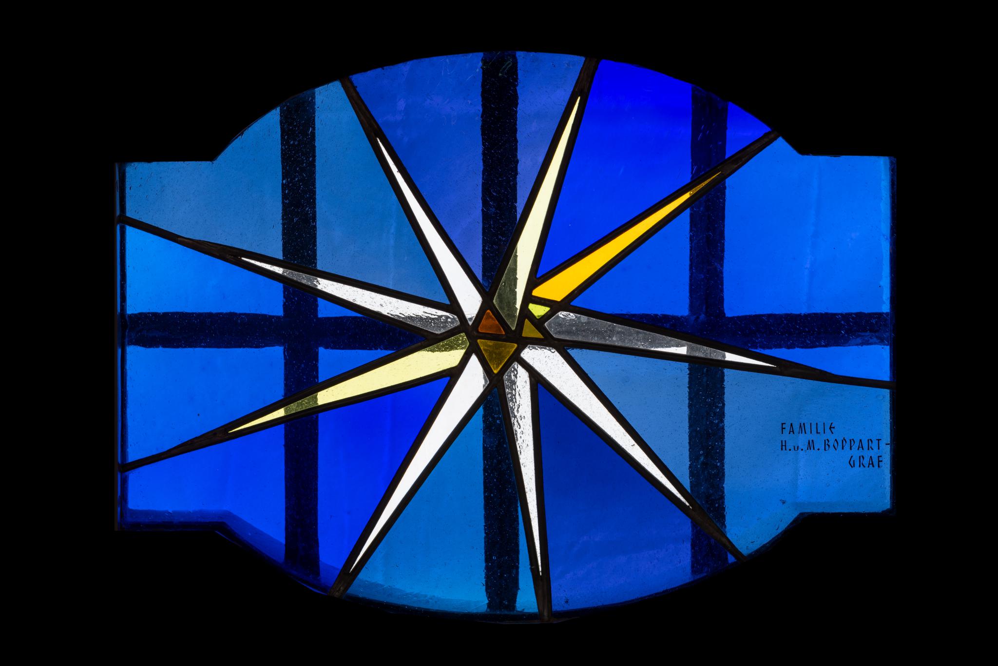 Kartuschenförmiges Fenster aus überwiegend blau durchgefärbtem Glas. Die spitzen Zacken des Sterns sind aus weissem stark gebläseltem wie auch gelb- und orangefarbenem Glas in den blauen Farbgrund eingesetzt. Die sternförmig von aussen nach innen verlaufenden Bleiruten bilden den Morgenstern als Teil einer Mariensymbolik.