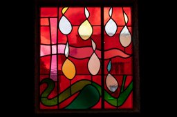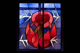 Quadratische Glasmalerei: Eine weisse Taube als Symbol des Heiligen Geistes stürzt vor einem gelben Kreis herab, ihr gehen grosse weisse Tropfen anstelle des ikonografisch typischeren Strahlenkranzes voran, die möglicherweise die Verbreitung des Glaubens symbolisieren. Unterhalb der Taube ein schmales dünnes Kreuz, parallel zur breiten Metallsprosse anstelle eines Windreisen. Aus dem Kreuz ergiesst sich Blut in die weisse Schale. Die Farbe Rot dominiert das Fenster.
