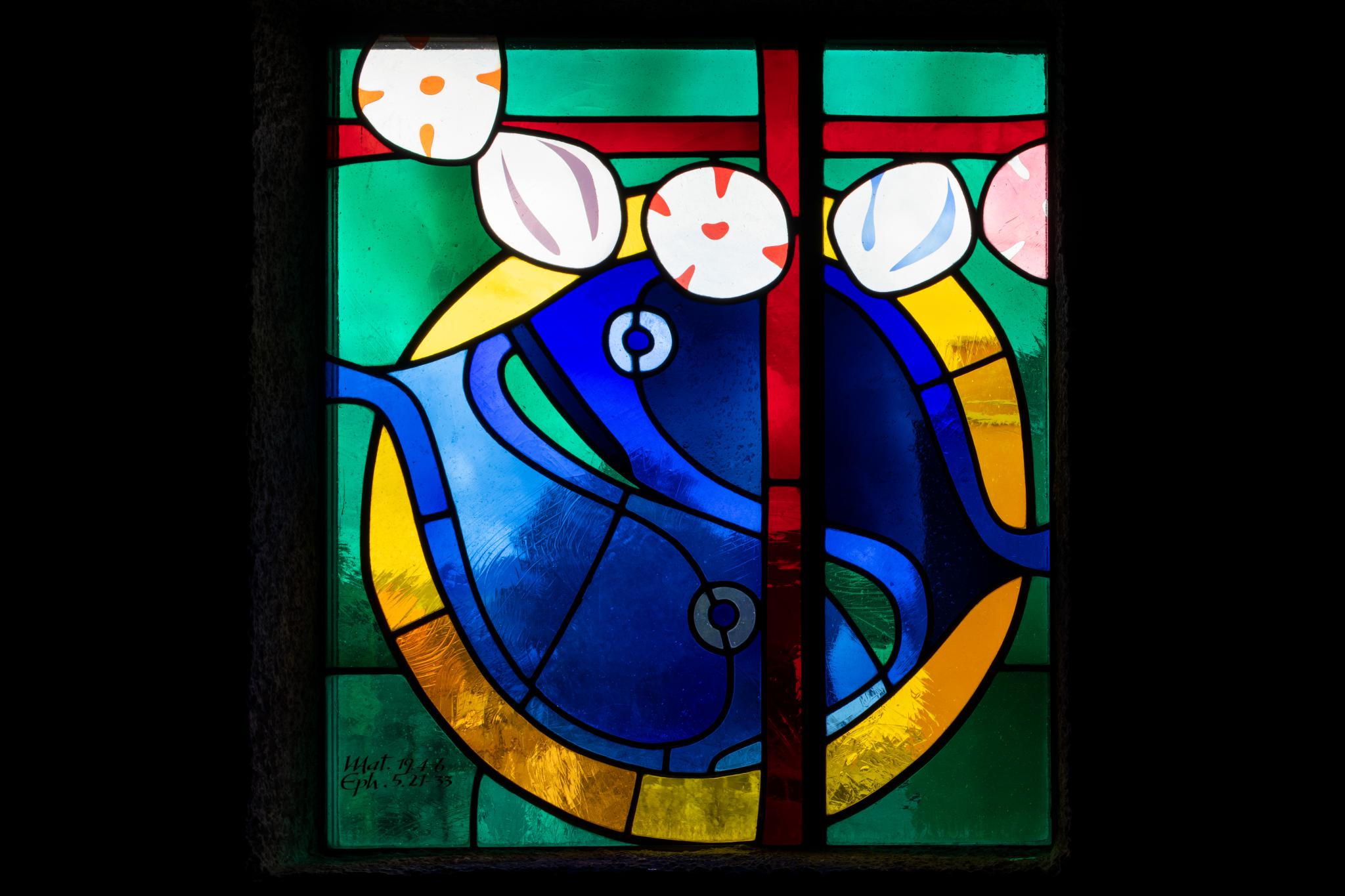 Quadratische Glasmalerei zum Thema des Ehesakraments: Vor dunkelgrünem Hintergrund vereinen sich zwei blaue Fische, umgeben von einem goldenen Ring. Ein rotes Kreuz gliedert den Bildraum, zu dem eine breite vertikale Metallsprosse (anstelle eines Windeisens) parallel verläuft, und segnet damit die Eheschliessung. Im oberen Drittel hängt eine Girlande aus weissen Kugeln mit bunten Verzierungen, wofür Überfangglas verwendet wurde, als Zeichen der Früchte der Ehe.