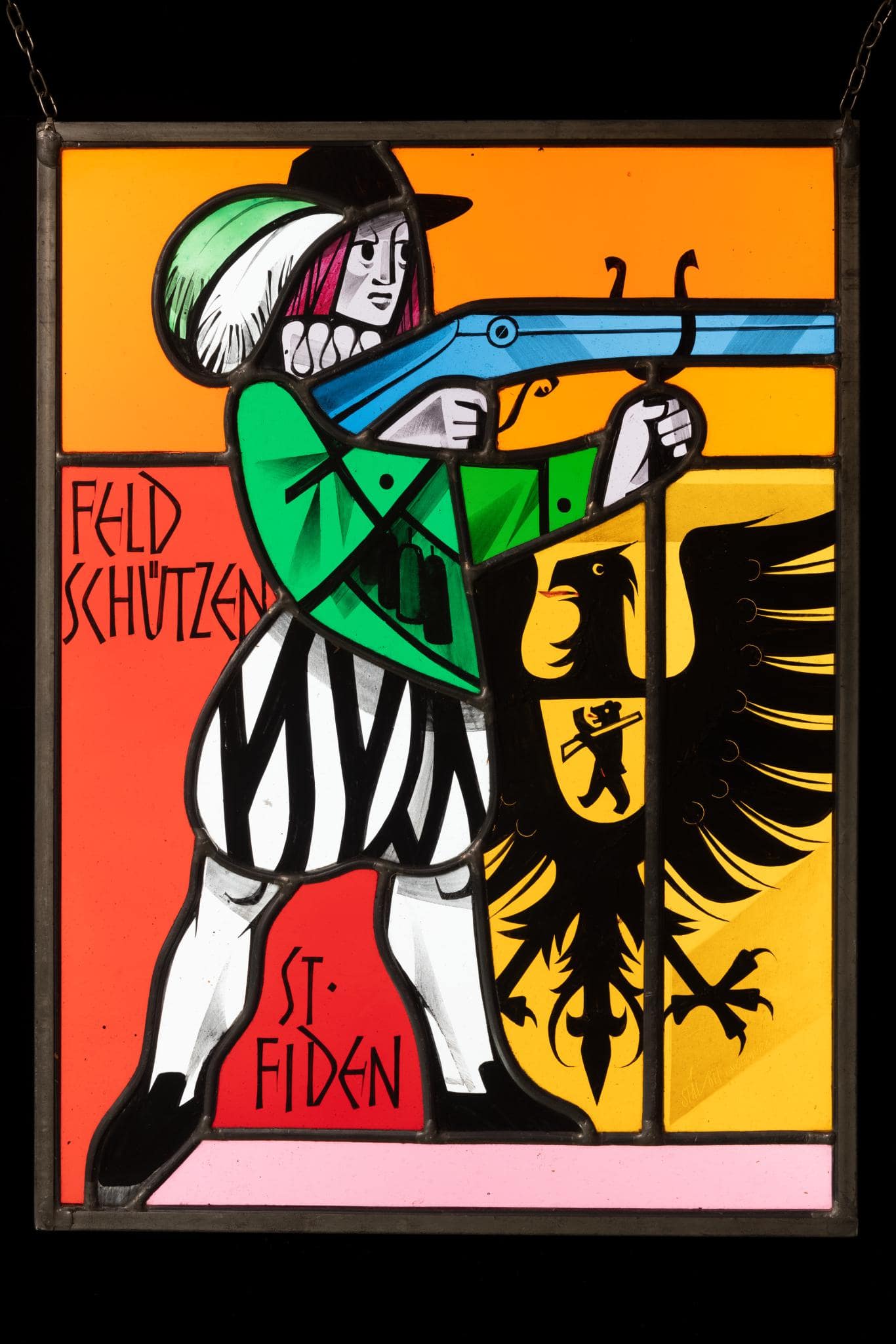 Hochrechteckige Glasmalerei, die einen breitbeinig stehenden Mann mit historischem Gewehr zeigt. Der Mann blickt im Dreiviertelprofil nach rechts. Er trägt ein historisches Gewand mit grünem Wams, schwarz-weiss gestreifter Pluderhosen und weissen Strümpfen, dazu einen schwarzen Hut mit Federn und Halskrause. Er hat eine historische Waffe angelegt, möglicherweise eine Radschlossbüchse mit geschwungenem Abzugsbügel, die aufgrund ihres Gewichts auf eine Stützgabel gelegt wird. Unterhalb des Gewehrlaufs das Wappen der Ortsgemeinde St. Gallen-Tablat in der historischen Fassung von vor 1978.