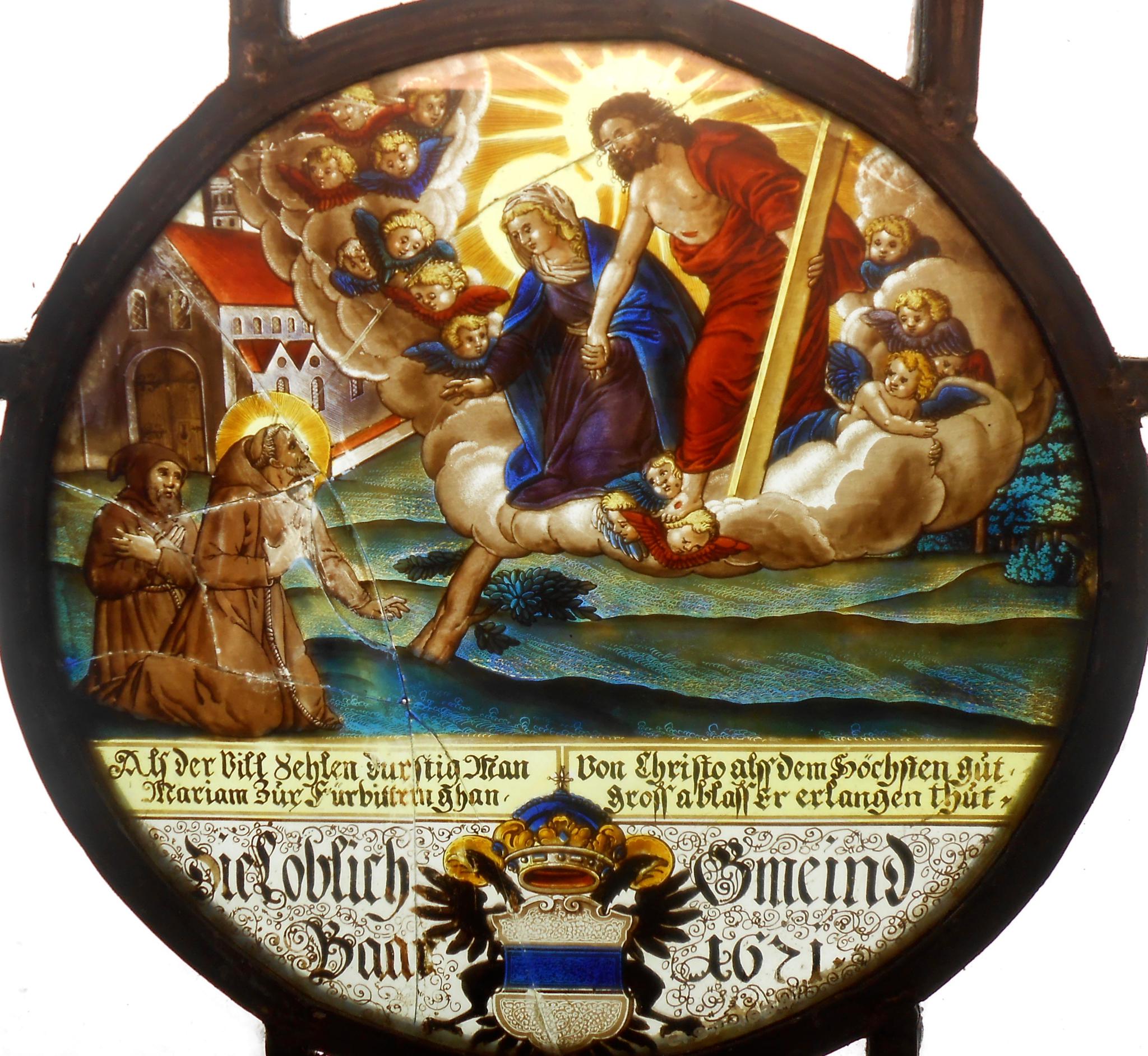 Le rondel représente un miracle relatif à la vie de saint François d’Assise relaté par Barthélemy de Pise : Jésus-Christ et la Vierge Marie apparurent à saint François d’Assise et à frère Masseo pour leur confirmer l’indulgence demandée au pape Honorius III pour l’église de Notre-Dame des Anges de Portioncule. Il constitue le quatorzième rondel d’une série dédiée à l’histoire de saint François d’Assise dont la production est documentée dans le livre de raison du peintre-verrier zougois Michael IV. Müller, conservé au Museum Burg Zug.
