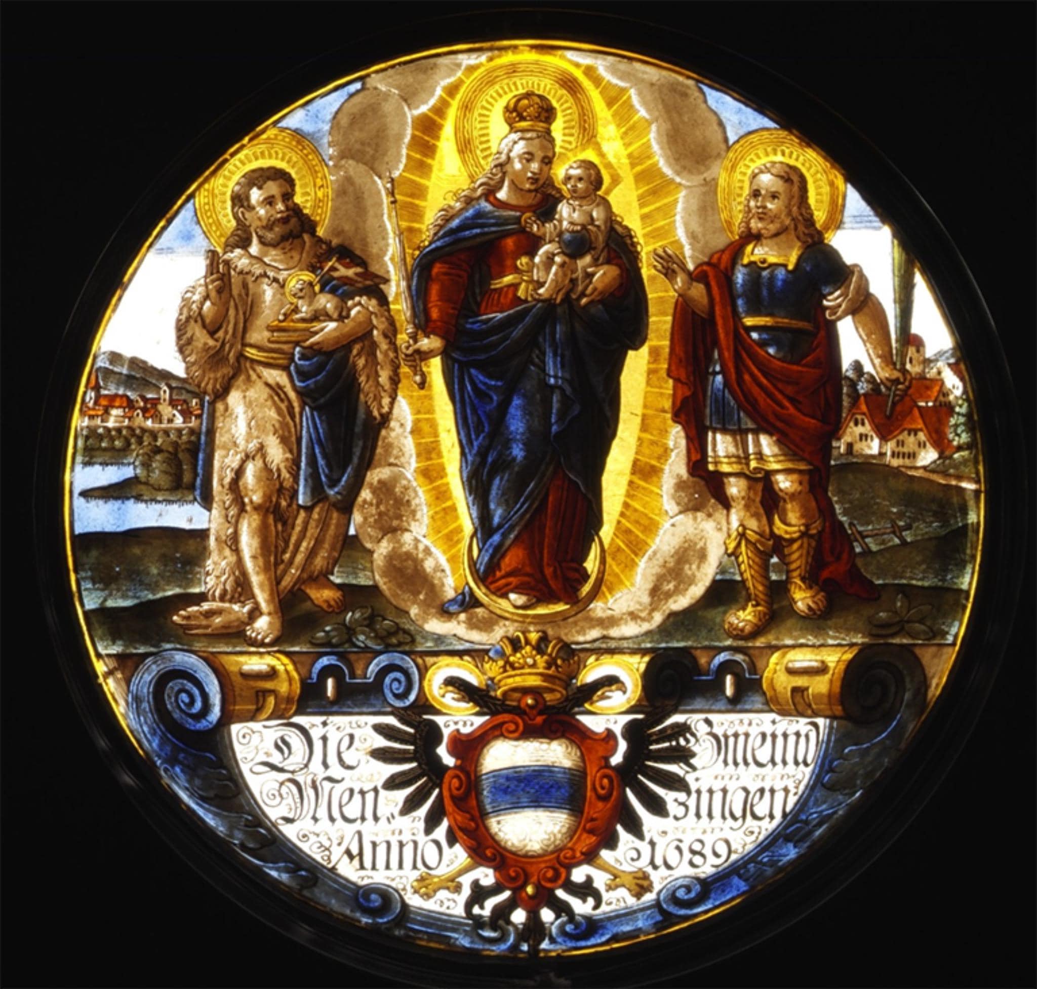 Le rondel représente, dans un paysage valonné, la Vierge Marie, accompagnée du Christ enfant et flanquée de deux saints, à gauche, saint Jean-Baptiste et à droite, un saint identifié comme saint Pélage. Il a vu le jour grâce à la générosite de la commune de Menzingen (ZG), dont saint Jean-Baptiste est le saint patron, ou à celle de quelque personne issue de la bourgeoisie ou du clergé de Zoug. L’emplacement d’origine de ce rondel n’a en revanche pas pu être établi.