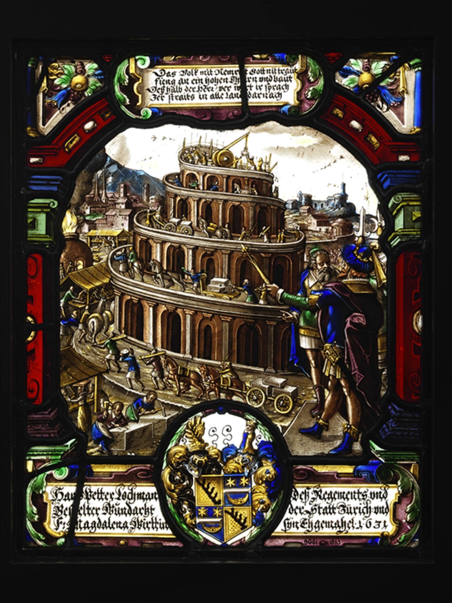 Vitrail historié aux armes de Hans Peter Lochmann : la tour de Babel