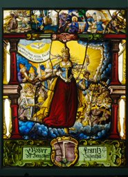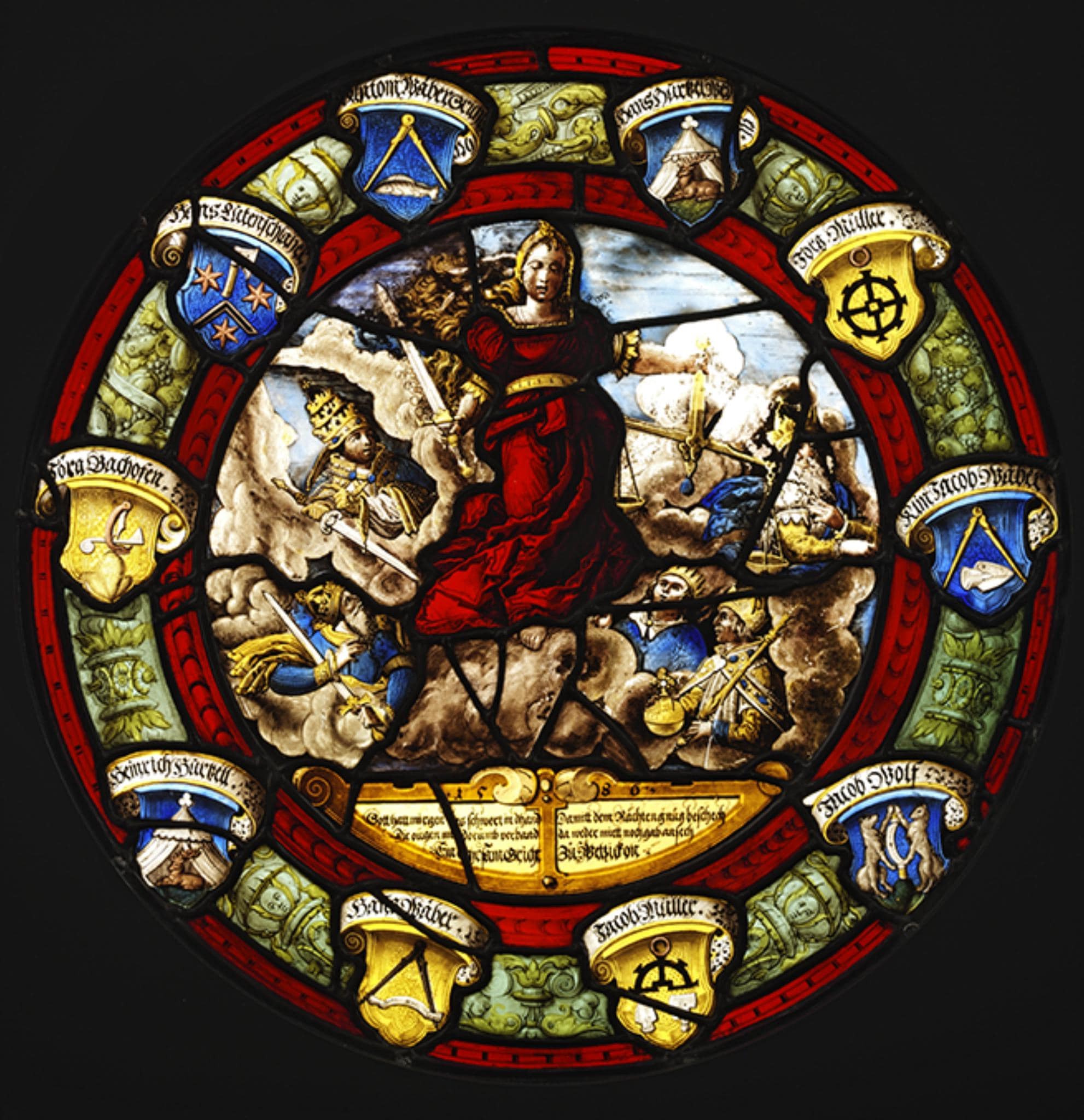 Le rondel représente une allégorie de la Justice, en pied, sur une nuée, triomphant sur la justice céleste et terrestre symbolisée par diverses figures humaines représentées en buste (pape, évêque, roi...). Selon Boesch, cette allégorie de la Justice dériverait librement d’un dessin attribué au peintre schaffhousois Tobias Stimmer (1539-1584), daté vers 1562-1563 et aujourd’hui conservé à la Staatlichen Kunsthalle de Karlsruhe, où l’on retrouve une composition semblable représentant la figure féminine foulant dans une nuée pape, rois et princes, dont il existe un variante dessinée conservée à l’Ecole polytechnique de Zurich due au peintre-verrier Hans Jakob Plepp (vers 1557/60-1597/8), actif entre Berne et Bâle dans le dernier quart du XVIe siècle (V&A, documentation, état du 20 décembre 2013 ; Cat. exp. Bâle 1984, cat. 265 ; Mensger 2009, p. 43 ; id. 2012, cat. 799).