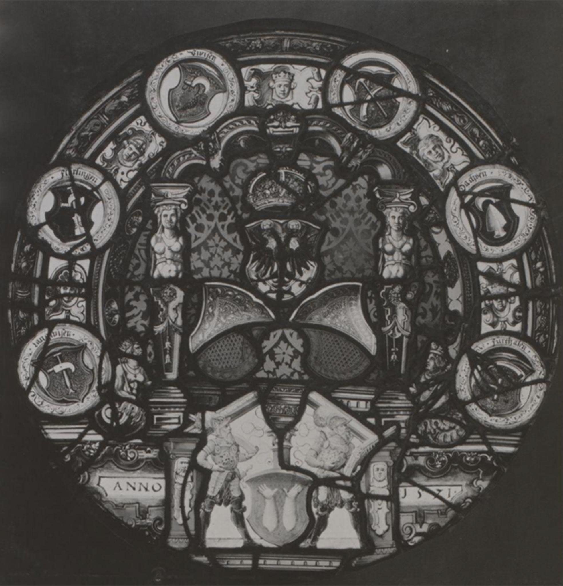 Unzählige Notbleie, einzelne Sprünge. Podest links, Figur unten rechts neben Wappen Fürthalen und Teil des Wappens oben rechts ergänzt.