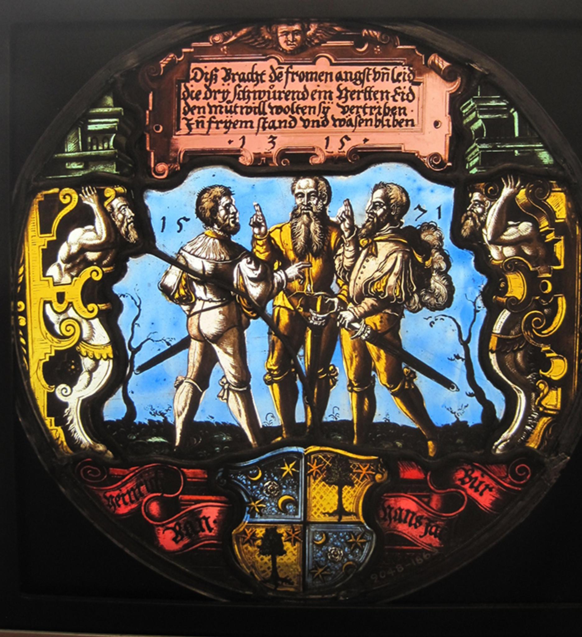 Les donateurs de ce rondel sont Heinrich Ban et Hans Jakob Baur. Si le second n’a pas pu être identifié avec certitude parmi les homonymes de cette période (Zurich, Archives d’Etat), le premier est le peintre-verrier Heinrich Ban (vers 1515/20-1599), documenté et établi à Zurich (cf. Bergmann 2004b, p. 211ss).