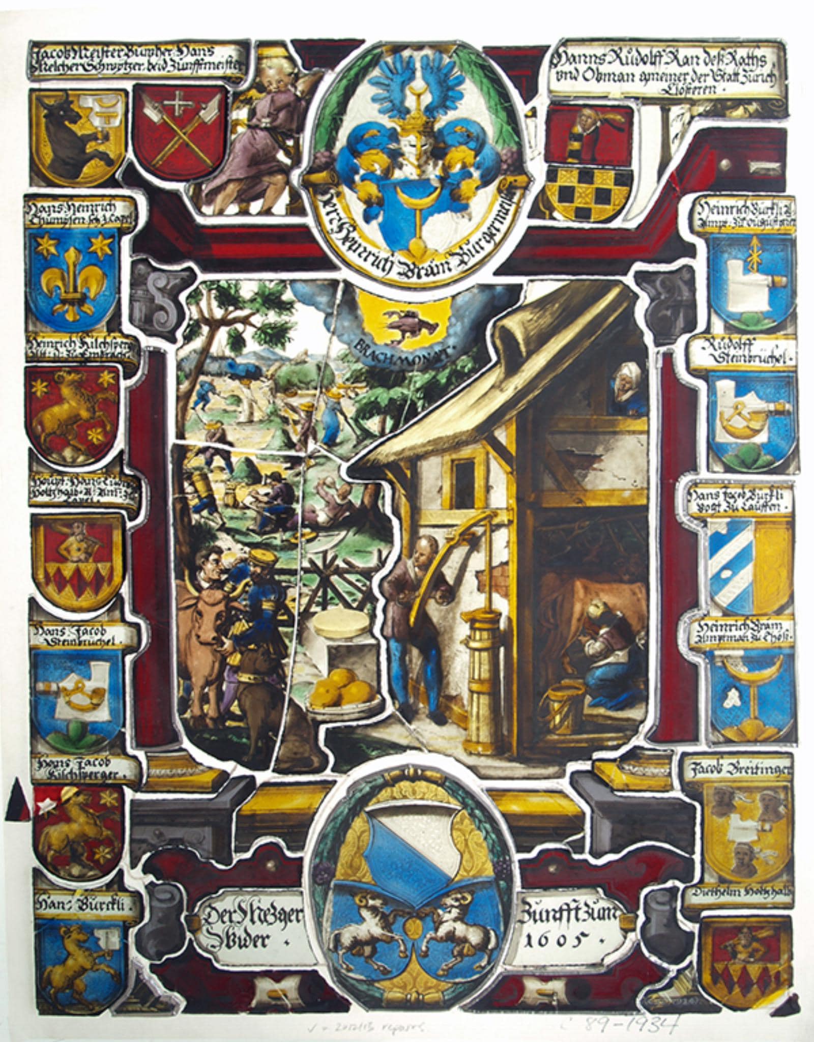Inscription des armoiries représentées sur le cadre (sens horaire) : „Herr Heinrich Bräm Bürgermeister“ ; „Hanns Ru(o)dolff Ran dess Raths / vnd Obman gmeiner der Statt Zürich / Clösteren.“ ; „Heinrich Bürkli al: / Ampt: Zu(o): Augustyner“ ; „Ru(o)dolff / Steinbrüchel.“ ; „Hans Jacob Bürkli / Vogt zu(o) Lauffen.“ ; „Heinrich Bräm / Amptman zu(o) Thöss.“ ; „Jacob Breitinger“ ; „Diethelm Holtzhalb“ ; “Hans Bürckli“ ; „Hans Jacob / Kilchsperger.“ ; „Hans Jacob / Steinbrüchel.“ ; „Hou(o)pt. Hans Ludwig / Holtzhalb · A: Am. zu(o) / Kapel.“ ; „Heinrich Kilchsperger / Allt: A: zu(o) Embrach.“ ; „Hans Heinrich / Thumÿsen Sch. Z. Capel.“ ; „Jacob Meister Bu(o)wher: Hans / Melcher Schwÿtzer, beid Zunfftmeister“.