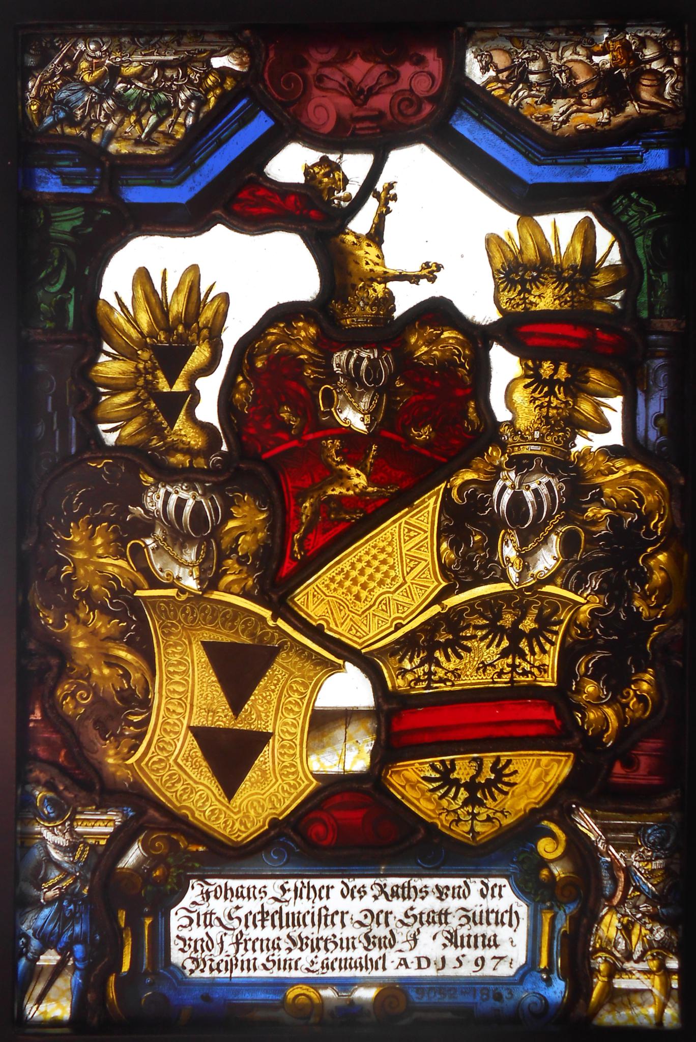 Le vitrail représente les armes d’importantes familles bourgeoises de Zurich. Originaire de Kaiserstuhl où elle est mentionnée pour la première fois en 1190, la famille Escher se subdivise en deux branches : les Escher vom Glas (du Verre) et les Escher vom Luchs (du Lynx).