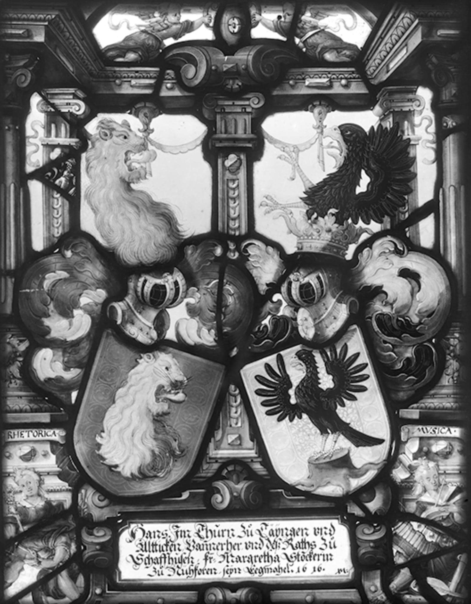 Le vitrail représente au centre d’un cadre architecturé, composé de quatre colonnes soutenant une architrave, sur laquelle campent deux angelots, deux écus armoriés, chacun surmonté d’un heaume empanaché ainsi que, à gauche, d’un lion et, à droite, d’un aigle ; dans la partie inférieure figure, entre deux allégories féminines représentant deux des septs arts libéraux, à savoir, inscrit sur un cartouche, à gauche, la Rhétorique et, à droite, la Musique, un cartouche avec du texte en lettres gothiques déclinant le nom des donateurs, le nom de la ville de Schaffhouse ainsi que la date de 1616, suivie du monogramme „IM“.