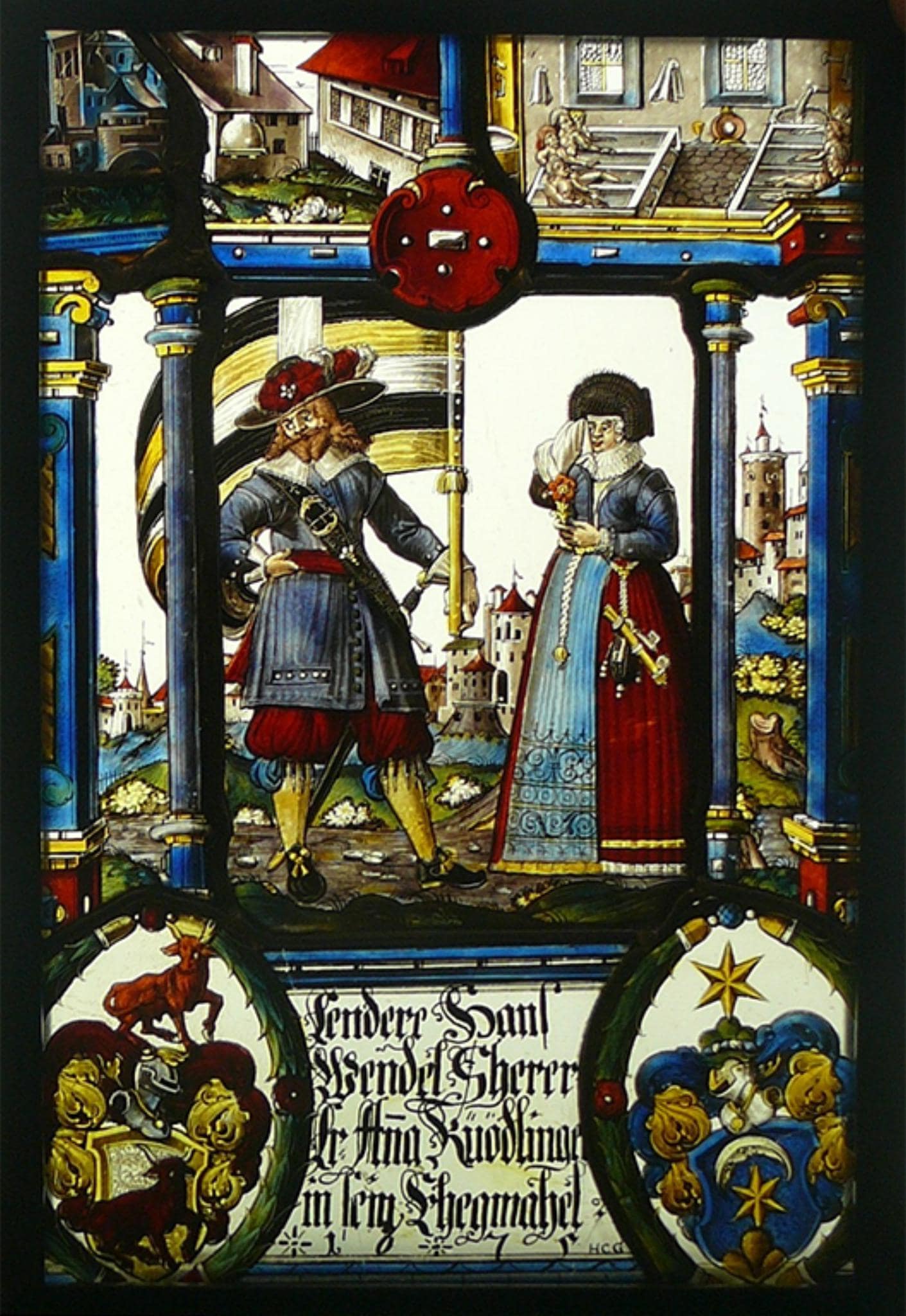 Boesch signale deux autres vitraux sur lesquels figurent le monogramme „HCG“ ainsi que le patronyme „Scherer“ : le premier, daté de 1675 et précisément conservé au Victoria & Albert Museum, constitue un pendant au présent vitrail (id. 1935b, nos 23 et 24 ; id. 1935a, no 182, soit VAM_65) ; le second, daté de 1680 et conservé au Musée de Cluny, mentionne comme donateurs Johannes Maggion et Maria Lisabet Ruotz, le premier apparaissant aux côtés de celui de „Fändrich Wendel Scherrer im Thurtal“ dans un document d’archives que Boesch date vers 1678 (“Mannschaftsrödel“ – ibid., p. 74, no 195), confortant ainsi l’identification ainsi que l’attribution du panneau de Londres.