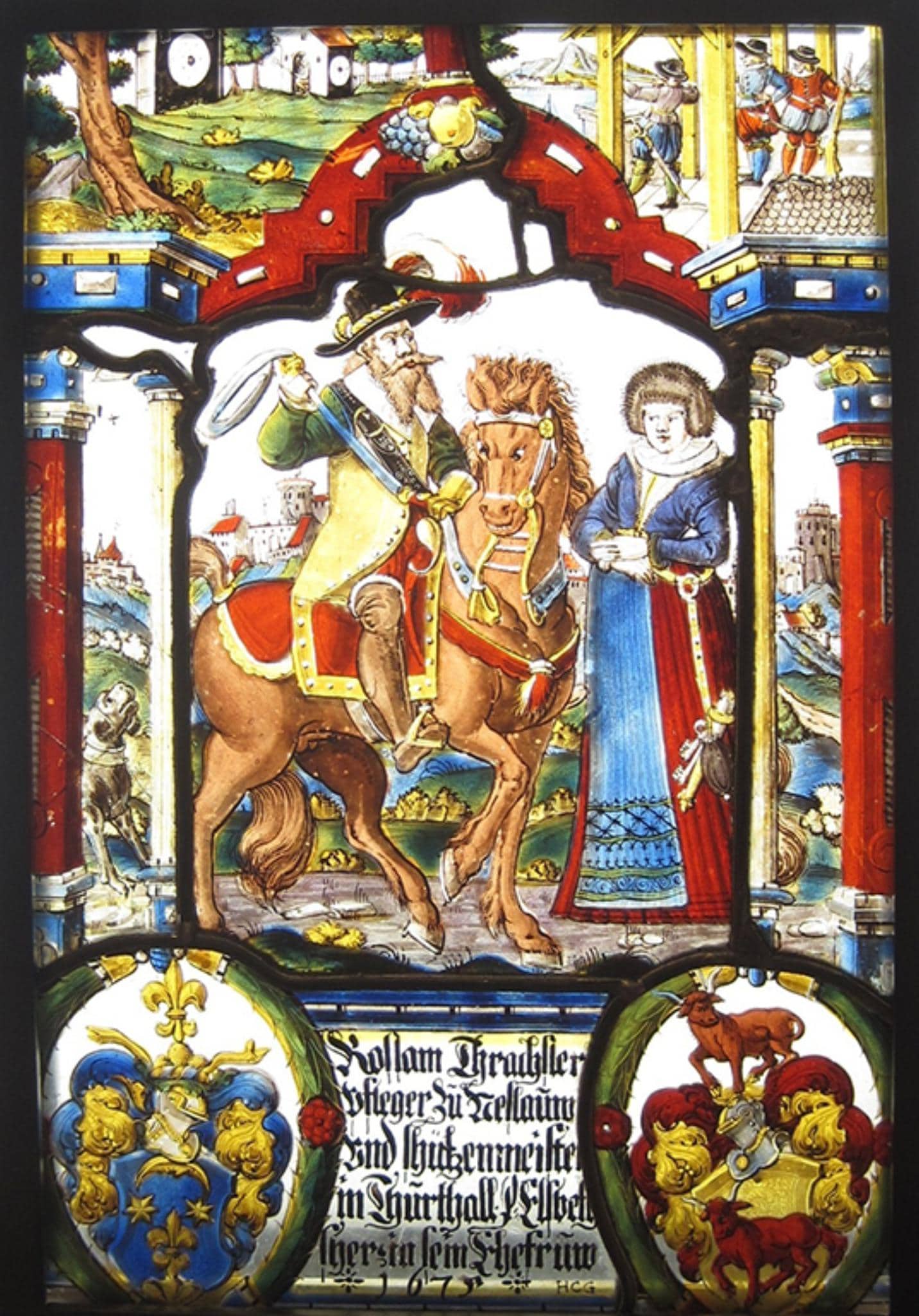 Les armoiries qui accompagnent le patronyme Trachsler font références aux Trachsler de Nesslau (SG), dans la région du Toggenburg, dans le canton de Saint-Gall, tout comme les Scherer mentionnés dans le panneau de Londres (cf. Boesch 1943, p. 58). Né le 6 août 1635, Rosam Trachsler se maria en premières noces le 2 juillet 1656 avec Salome Blüemlin, fille d’Adam Blümlin, dont un vitrail, daté de 1645, porte ses armes ainsi que celles d’Elisabeth Luffi, sa femme – ce vitrail, provenant de la collection Dr. Schubart, a été vendu en 1899 chez Hugo Helbing (cf. Boesch 1935a, p. 58-59, no 149). Après le décès de cette dernière, il se maria en secondes noces entre 1667 et 1668 avec Elsbeth Scherer, laquelle fut baptisée le 16 juin 1650.