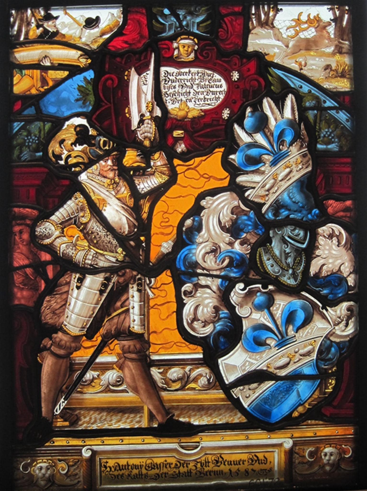 En 2016, Rolf Hasler, Sarah Keller et Uta Bergmann rapprochèrent le vitrail de Londres d’un vitrail héraldique aux armes de Beat Ludwig von Mülinen, daté de 1587, qui présente de mêmes dimensions , une composition semblable ainsi qu’un même rythme que le panneau de Londres (Hasler, Keller et Bergmann 2016b, BE_314, consulté le 20 octobre 2020). Ces deux panneau sont dûs de toute évidence au même peintre-verrier, probablement actif à Berne, et pourraient, selon toute vraisemblance, être issus d’une même série.