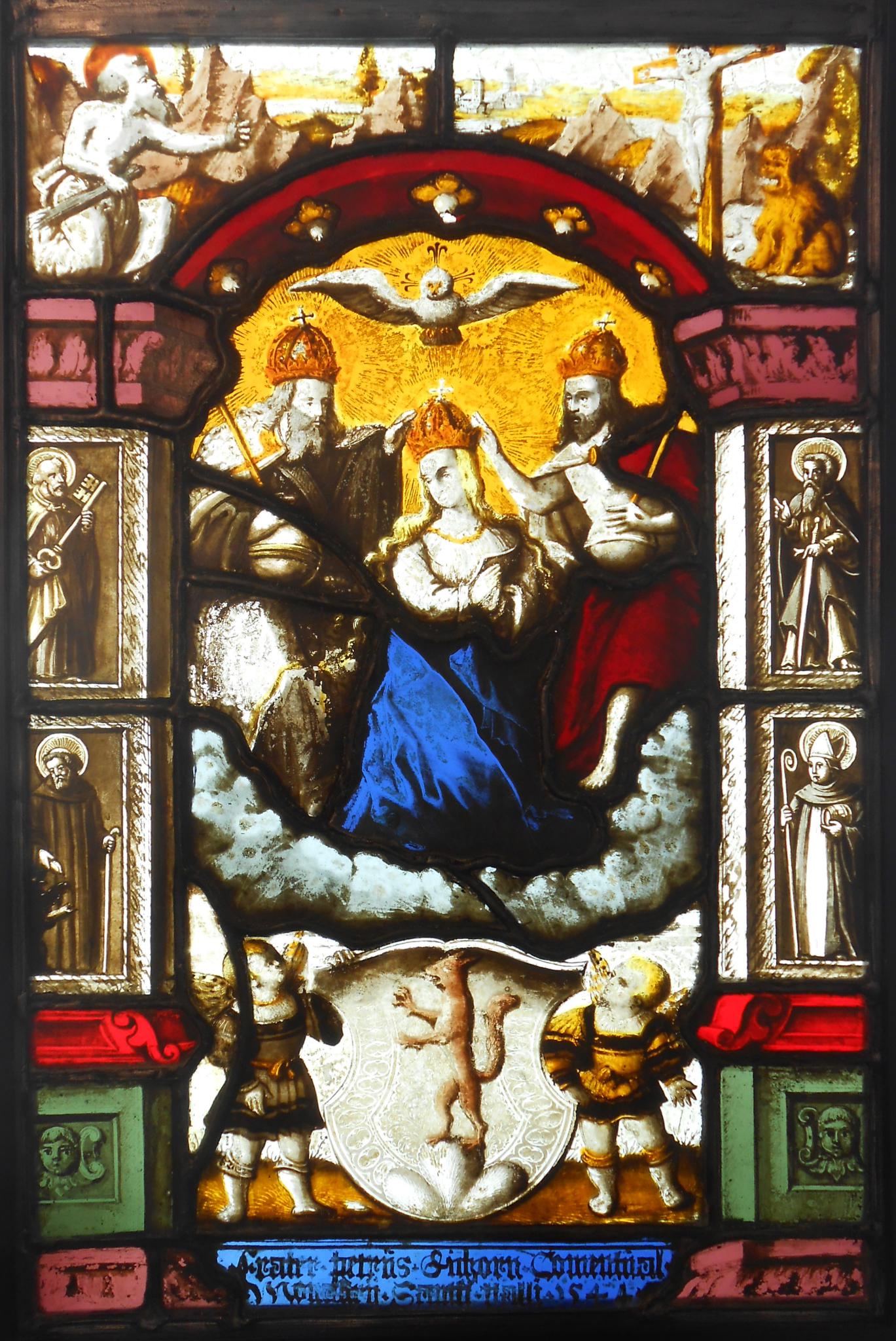 Aucun modèle peint, dessiné ou gravé du Couronnement de la Vierge par la Trinitié n’a été identifié, bien qu’il existe un vitrail qui semble partager une même invention, attribué à Carl von Egeri et aujourd’hui conservé au Musée Ariana à Genève (inv. AD 8593). Selon Paul Boesch, les deux saints non identifiés, représentés aux côtés de saint Pierre et saint Paul, pourraient en revanche correspondre à Gall et Othmar, les saints patrons de Saint-Gall (ibid.).