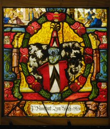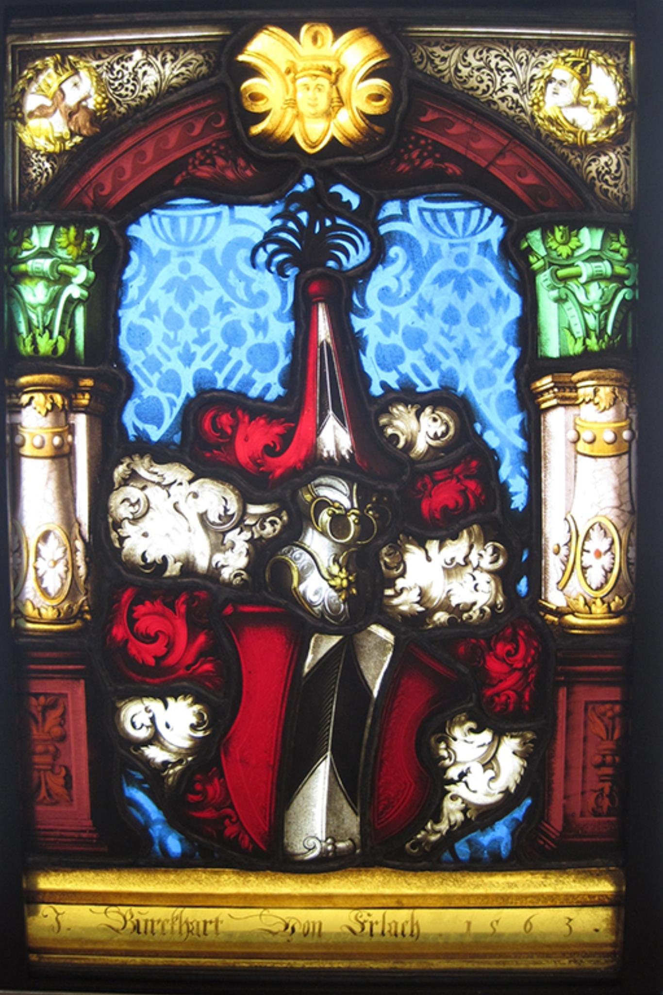 En 1935, Hans Lehmann émit l’hypothèse selon laquelle le vitrail aurait été exécuté par le peintre-verrier bernois Joseph Gösler (doc. 1540-1585), dont il n’existe toutefois aucune oeuvre sûre ou signée de ce dernier (V&A, documentation, état du 20 décembre 2013). En 1952, Paul Boesch fit observer qu’il s’agit d’une copie, vraisemblablement du XIXe siècle (ibid.).
