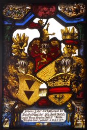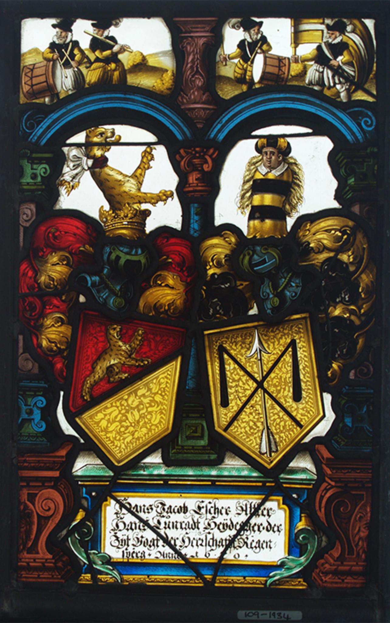 Du XVe siècle au XIXe siècle, les Escher vom Luchs comptèrent parmi les familles les plus riches et puissantes de Zurich (cf. Hürlimann 2012, consulté le 11 février 2021). Fils de Hans Jakob Escher vom Luchs et de Verena Wirz, dont le Victoria and Albert Museum possède un vitrail héraldique attribué à Christoph Murer (VAM_35), Hans Jakob Escher vom Luchs est né à Zurich en 1566 et mort en 1625. En 1586, il épousa Esther von Fulach, avec qui il eut au moins six enfants. Selon Hans Lehmann, Hans Jakob Escher vom Luchs aurait été en 1594 membre du Grand Conseil de la Ville de Zurich et, de 1602 à 1608, bailli de Regensberg avant de mourir en 1625 (V&A, documentation, état du 20 décembre 2013).