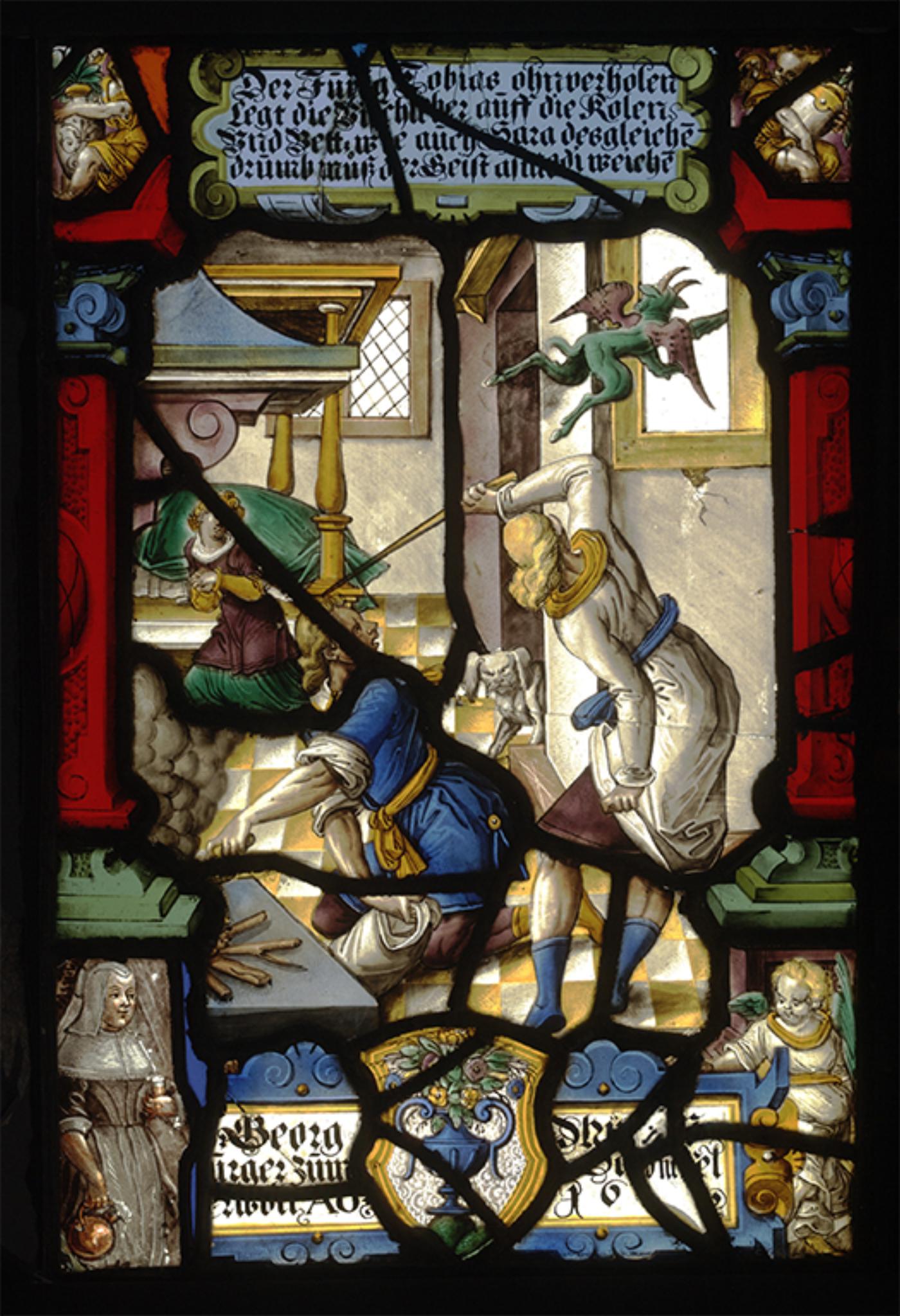 De grande qualité, ce vitrail, dont l’état de conservation est bon, représente une scène vétérotestamentaire tirée du Livre de Tobie, à savoir Tobie et l’ange Raphaël chassant un démont en brûlant le coeur et le foie d’un poisson (Tb 6, 15-17). Il fait partie d’une série de vitraux historiés qui retracent l’histoire de Tobie et qui furent commandés par la corporation strasbourgeoise „Zum Schöffel“, dont 10 sont conservés au Victoria & Albert Museum (VAM, inv. C.560 à 569-1921 – cf. Rackham 1936, p. 94).