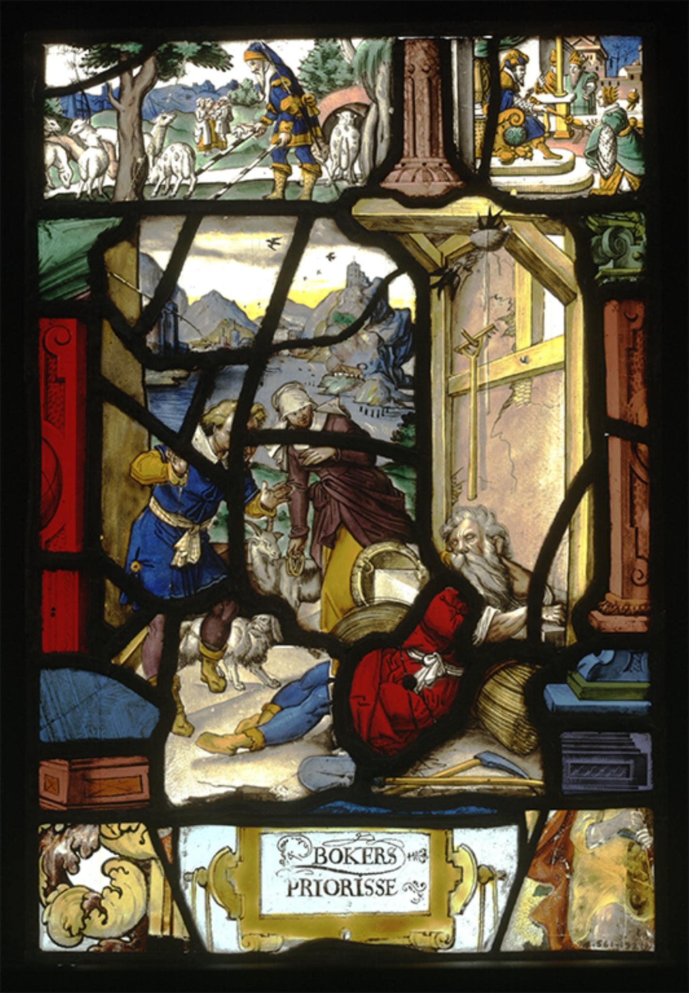 Vitrail historié aux armes absentes : l’aveuglement de Tobit