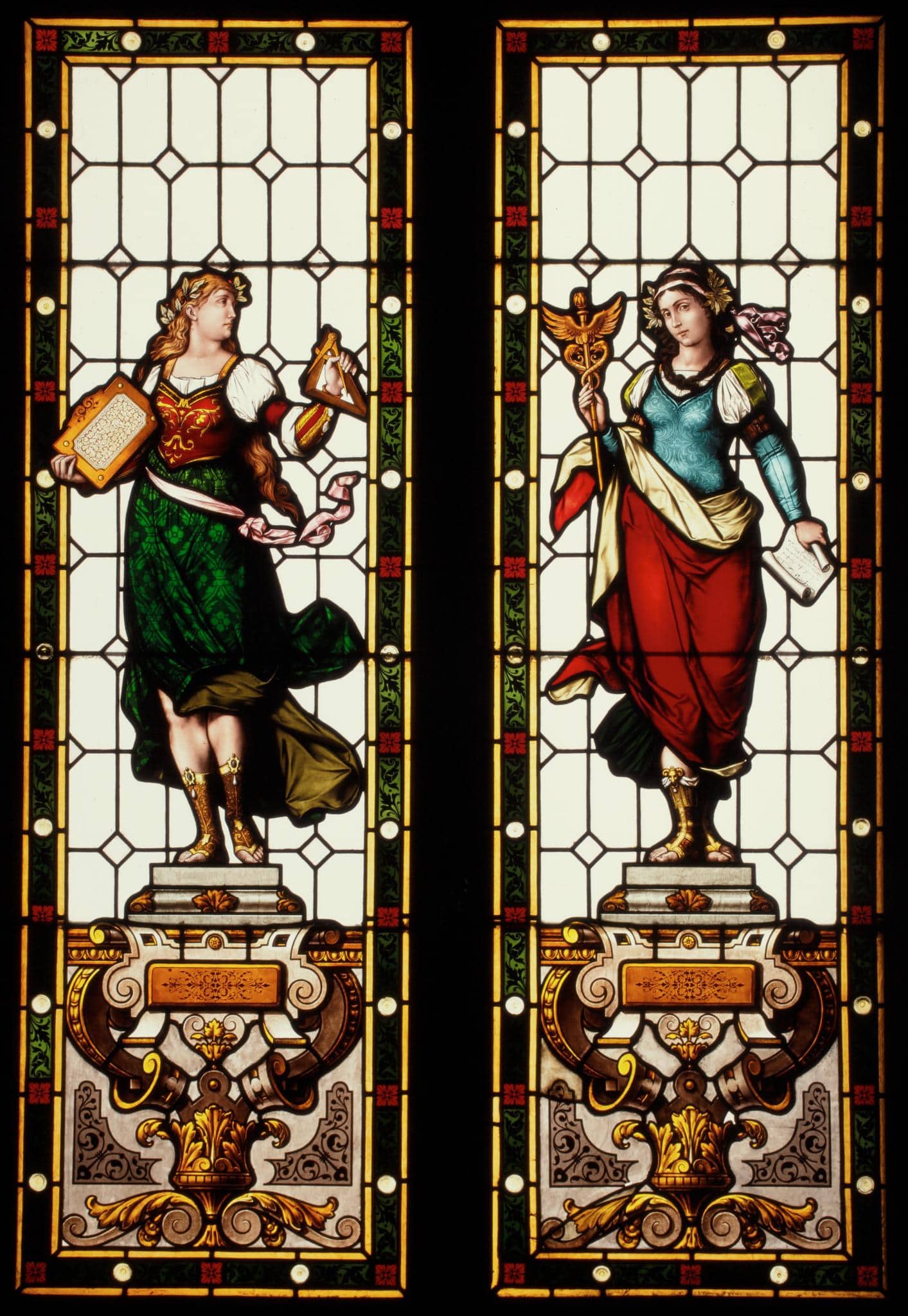 Links ist die Personifikation der «Industrie» zu sehen. Dieser Begriff lässt sich auf der Tafel in ihrer rechten Hand erkennen: In der mit Ornamenten verzierten Mitte sind Buchstaben von vorne ins Glas geätzt, so dass sie nur in bestimmten Lichtverhältnissen und von gewissen Blickwinkeln aus zu erkennen sind.