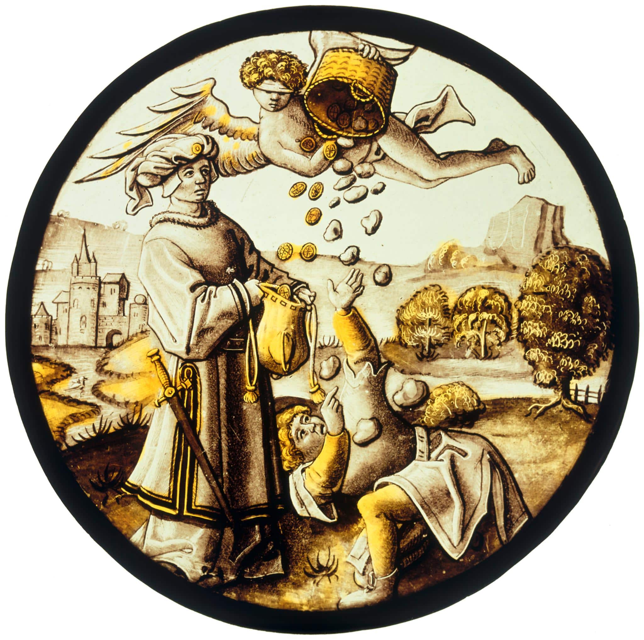 Le rondel représente, au centre d’un paysage valonné composé, à gauche, d’un bourg fortifié et, à droite, d’une campagne parsemée d’arbres, un garçon ailé, les yeux bandés, se tenant dans le ciel et déversant d’un panier en osier des pièces d’or et des pierres sur deux hommes, dont l’un, riche, en pied, recueille les pièces d’or dans une bourse déliée qu’il tient à deux mains et l’autre, pauvre, accroupi, ploie sous la pluie de pierres.