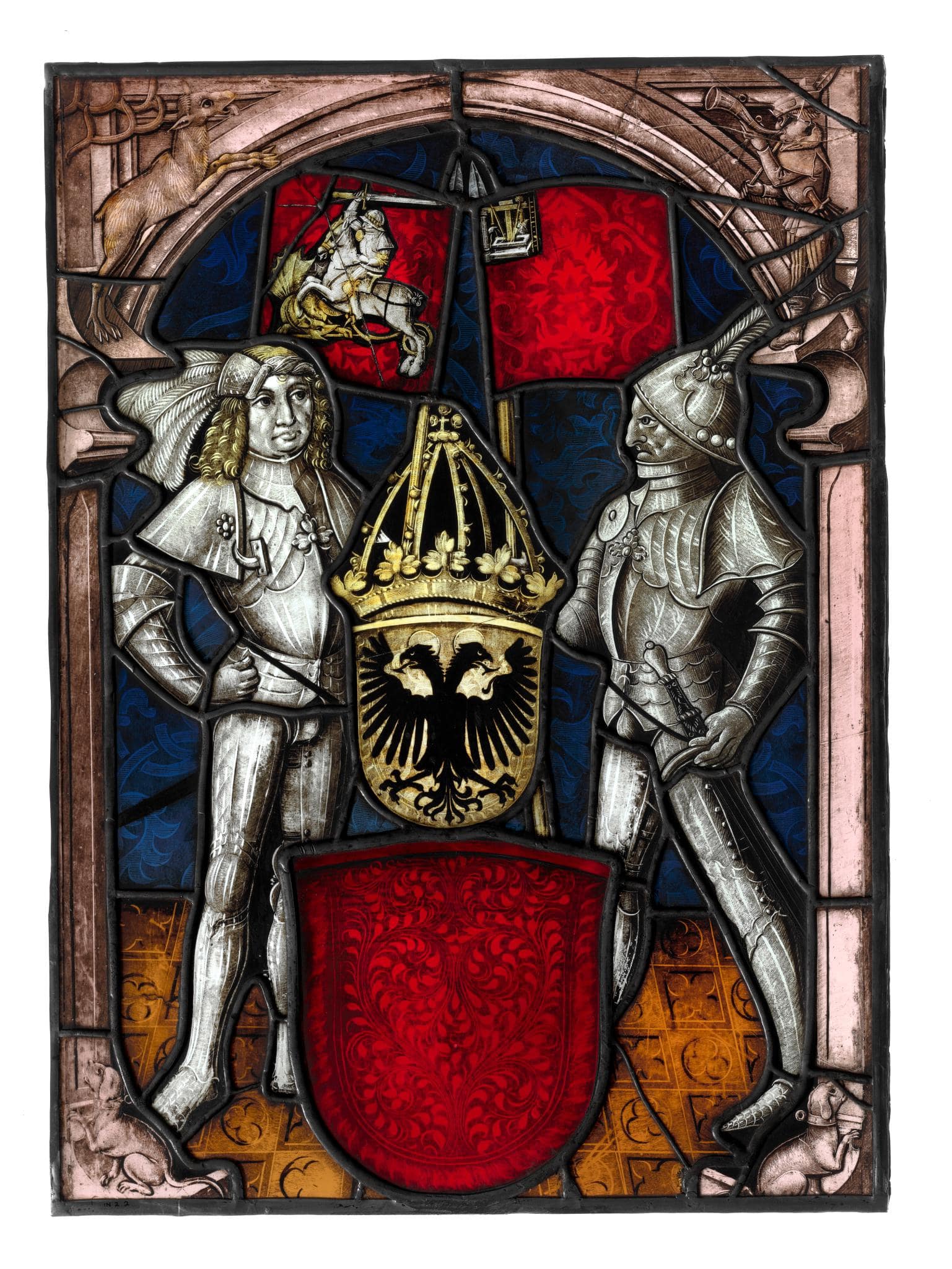 Farbloses und farbiges Glas; rotes Überfangglas mit vorderseitigem Ausschliff; Bemalung mit Schwarzlot und Silbergelb.