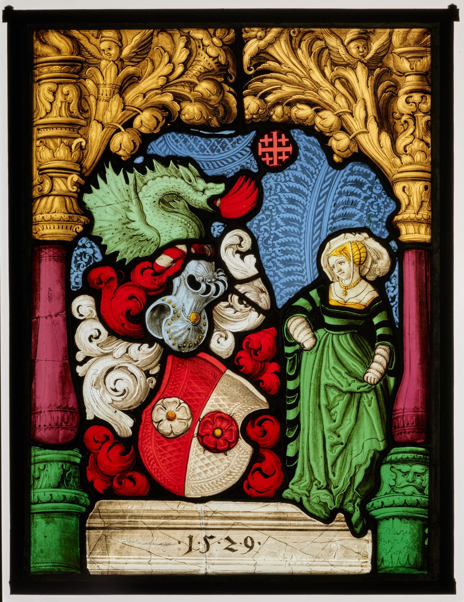 Die elegante Schildbegleiterin findet sich spiegelbildlich in analoger Form auf der Wappenscheibe des Urners Hans Brügger von 1540, die gleichfalls aus der Sammlung La Roche stammt und als Depositum der Gottfried Keller-Stiftung ans Schweizerischen Nationalmuseums in Zürich gelangt ist (Dep. GKS 3536; Glasgemälde 1983, S. 72f., Abb. 82; Gottfried Keller-Stiftung 1962, S. 68f., Abb. 26). Diese beiden auf die gleiche Vorlage zurückgehenden Frauengestalten verraten den deutlichen Einfluss Niklaus Manuels, dessen Schaffen für den zu seiner Zeit die Berner Glasmalerei prägenden Hans Funk vorbildhaft war. Wenn auch nicht auf diesen selbst, so dürfte die Wappenscheibe Arsent zumindest auf einen von dessen und Manuels Wirken inspirierten unbekannten Meister aus Bern oder Freiburg zurückgehen. Ihm zuweisen lässt sich ebenfalls die Wappenscheibe des Amé du Terraul aus dem Jahr 1532 (PB_19). Diese besitzt am unteren Rand ebenfalls Einritzungen aus dem 17. Jahrhundert mit Namenszügen, was ein Hinweis darauf sein könnte, dass sie sich damals am gleichen Ort wie diejenige des Wilhelm oder Peter Arsent befand.